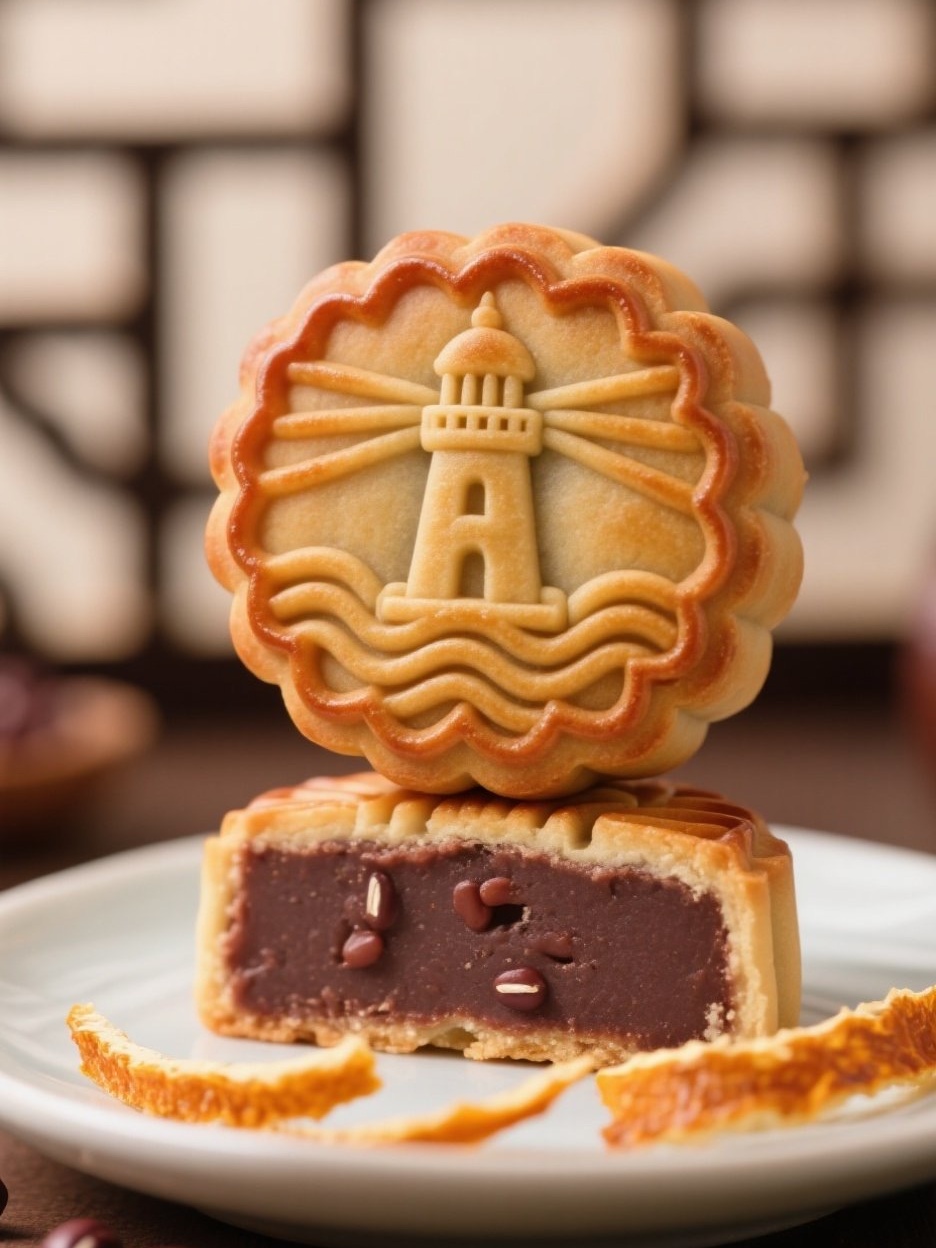 百年灯塔,以恒定的光束守护航道,像一位沉默的“城市守护者”。馅料选用红豆沙(软糯香甜,象征灯塔长久的温暖守护),加入十年新会陈皮(陈香醇厚,暗合灯塔的历史沉淀),饼边压出波浪纹,复刻灯塔光束在海面的涟漪。