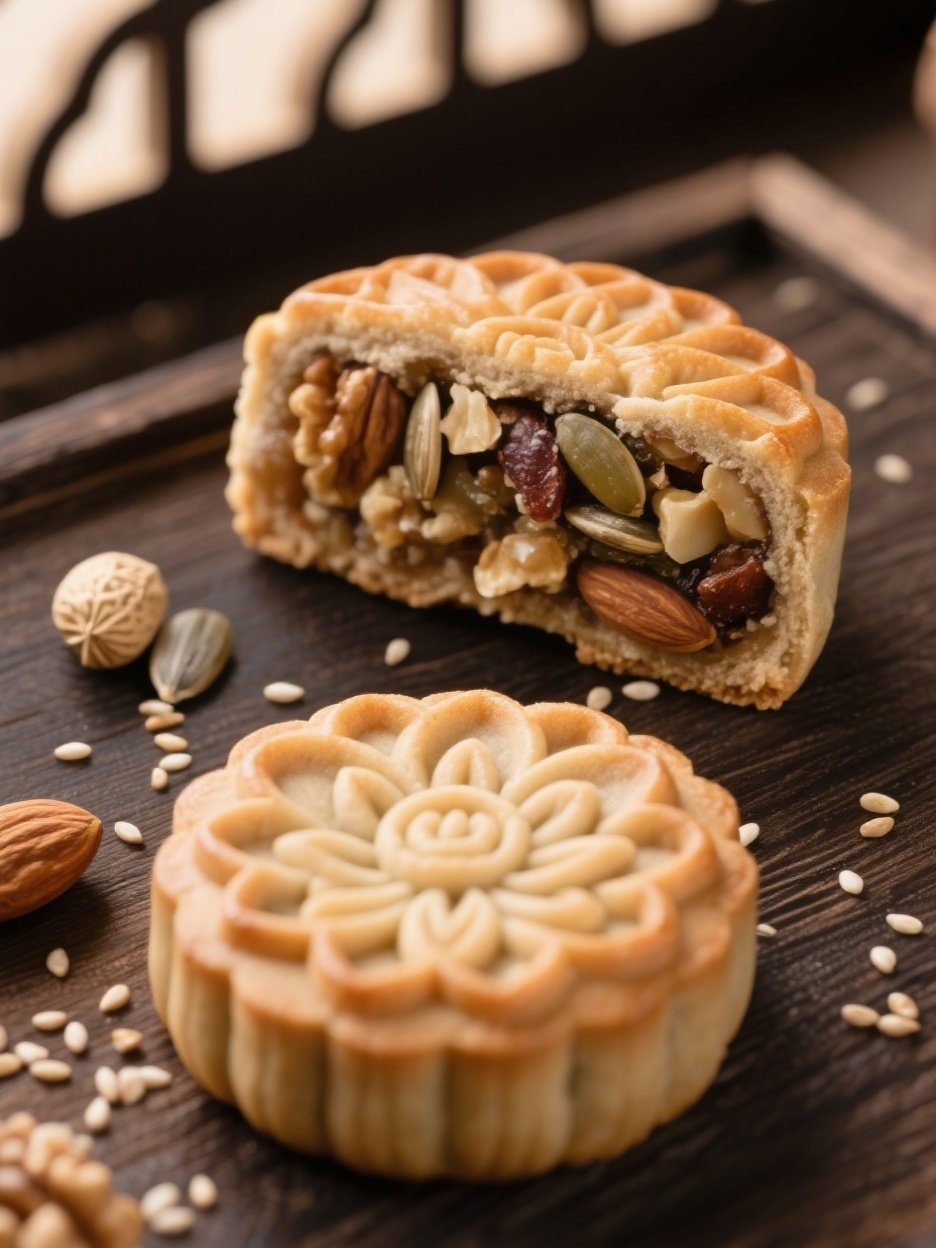 宝山寺的中秋是“静默的圆满”。馅料回归传统五仁(瓜子、花生、核桃、杏仁、芝麻,纯手工筛选),无添加、无荤腥,饼皮用荞麦粉(浅褐色,呼应寺庙的古朴),边缘刻莲花纹。