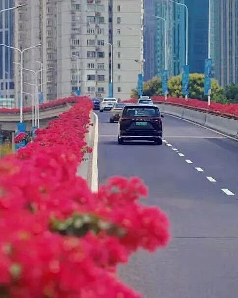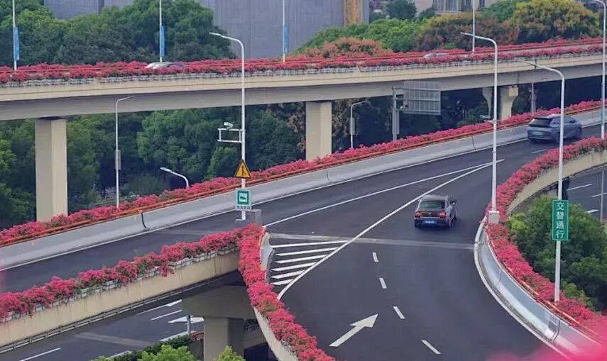 最近,行驶在延安高架上,不少市民发现了一路有繁花相伴,美不胜收。