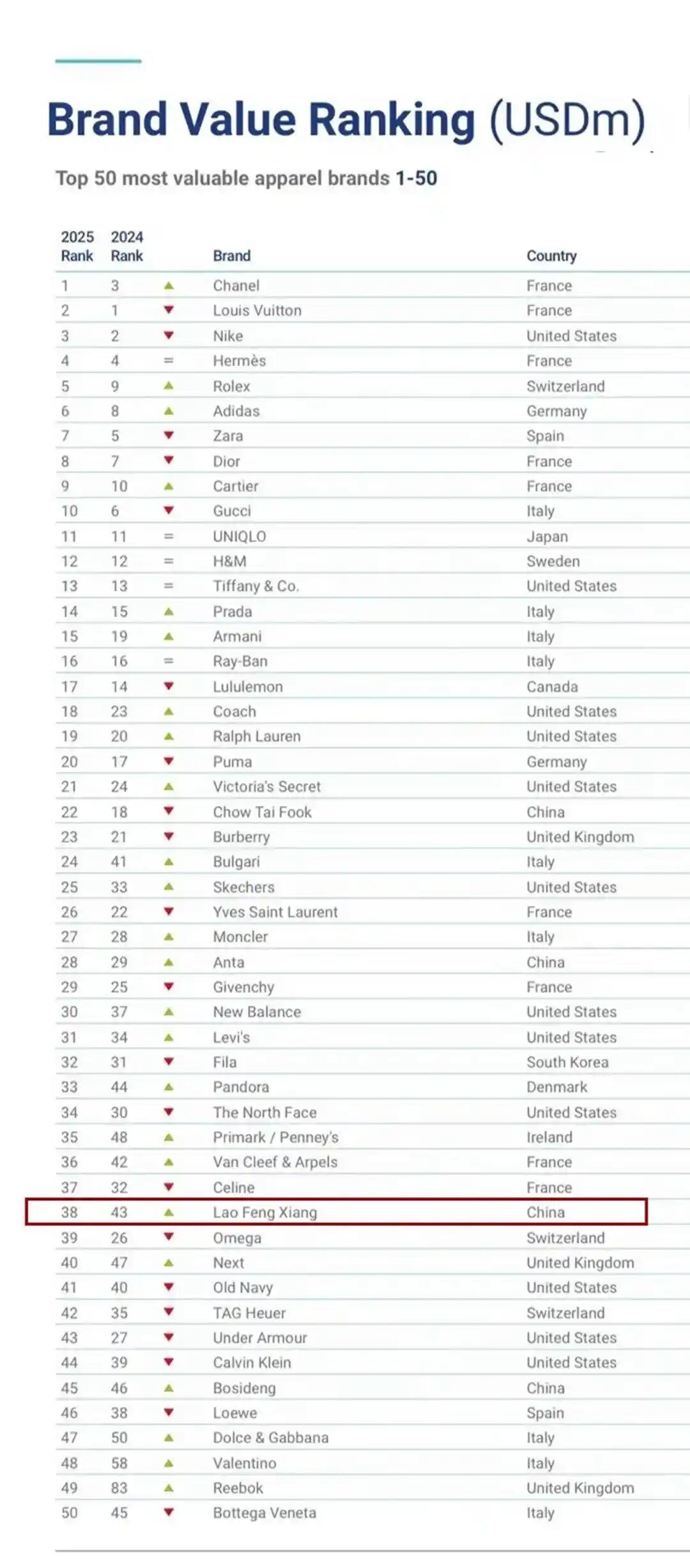 安踏、波司登以及周大福亦作为中国品牌位列榜单。Brand Finance中国区总裁陈忆登表示:“中国品牌的入围不仅体现了制造业的转型升级成果,更彰显了文化自信与创新能力的双重突破。”