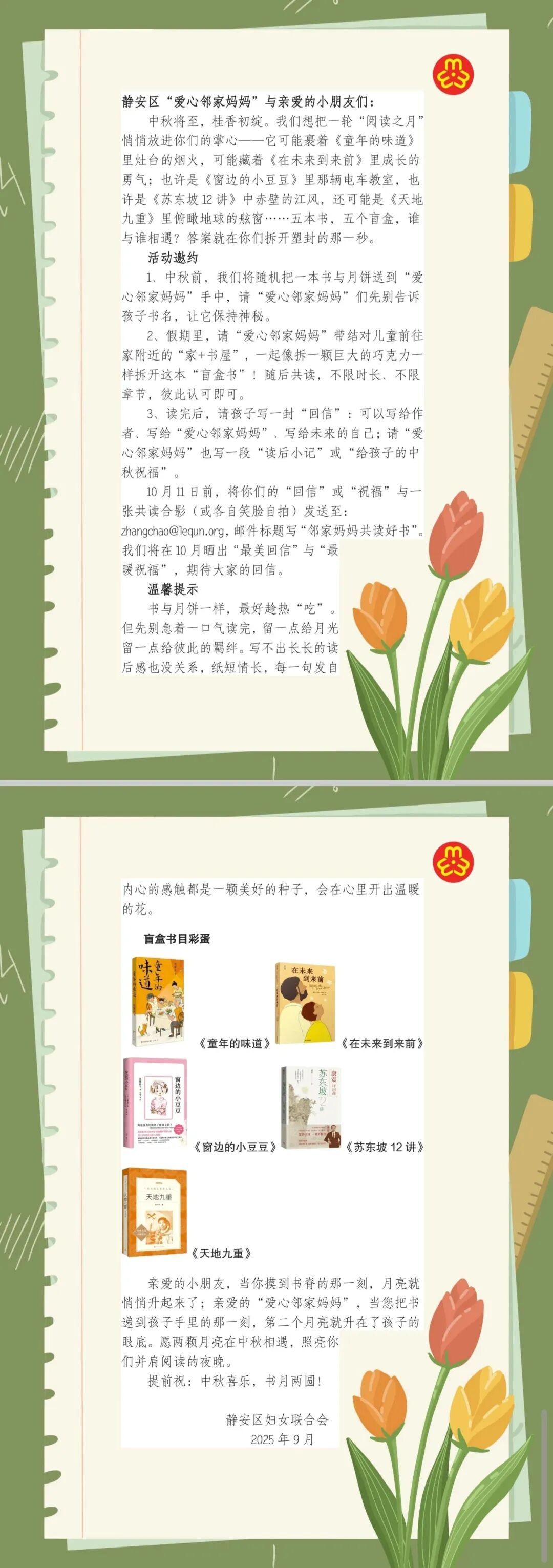 结合中秋假期,区妇联发出一份特殊“邀约”,邀请“爱心邻家妈妈”与结对儿童一同前往家附近的“家+书屋”,一起拆开一本配送的“盲盒书”,把一轮最美的“阅读之月”暖暖地放进结对儿童的掌心,用伴读传递“家”的温度和诠释“家”的力量。一份节日礼盒。