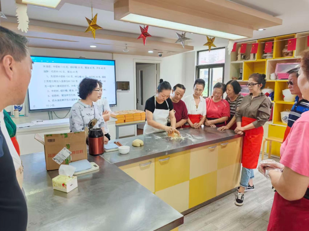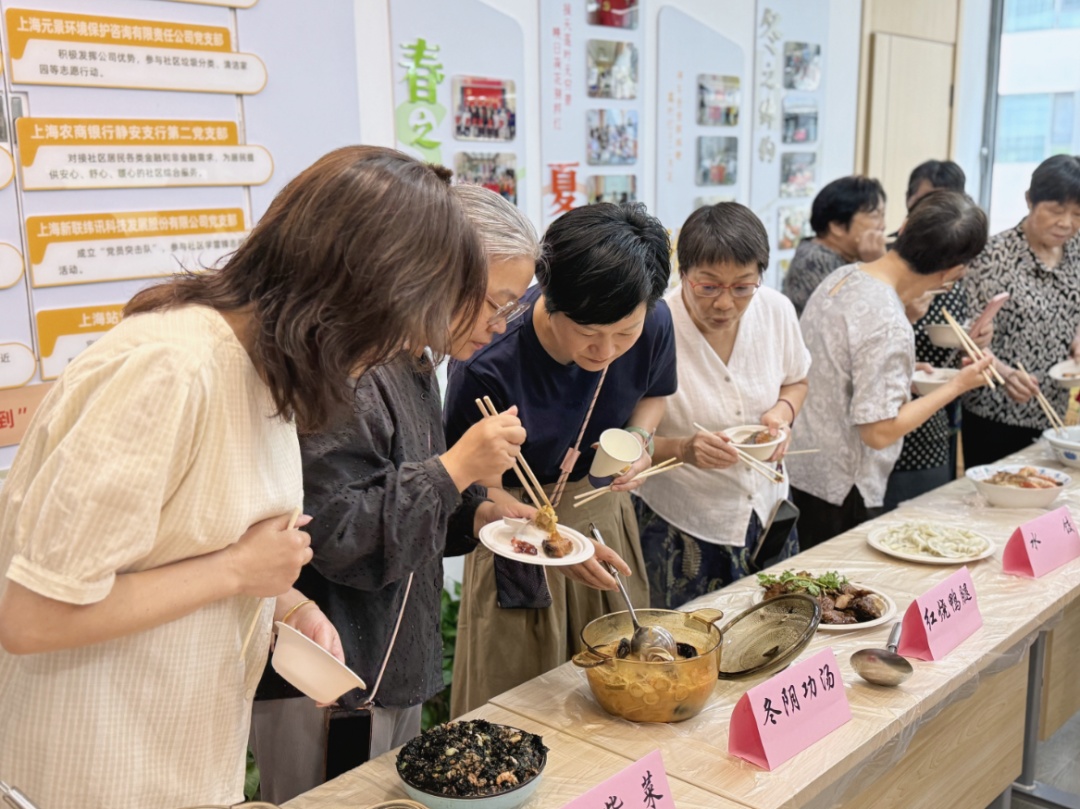 ,把长桌变成了“美食长廊”。巧手达人们齐聚一堂,纷纷拿出自己的看家本领。居民们围坐在一起,一边品味美食,一边交流着假期的出行计划,共同祝福国家繁荣昌盛。趣味评菜环节,大家用“插小旗子”的方式选出双节“厨神”,现场一片欢乐。华新居民区的“月满饼香双节同庆”活动