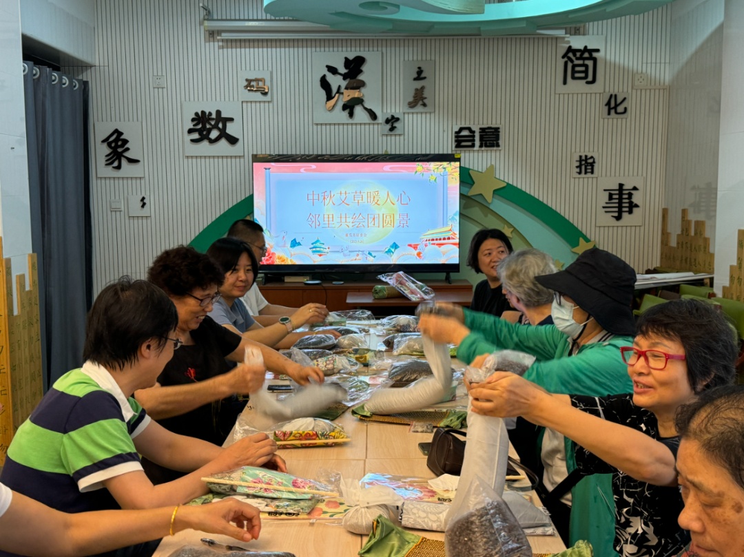 。工作人员提前准备好了充足的艾草、布料和棉线。大家围坐在一起,一边交流着中秋的传统习俗,一边动手填充艾草包,再缠绕棉线,将艾草包紧紧包裹,制作成一个个小巧可爱的香囊。铁新居民区的