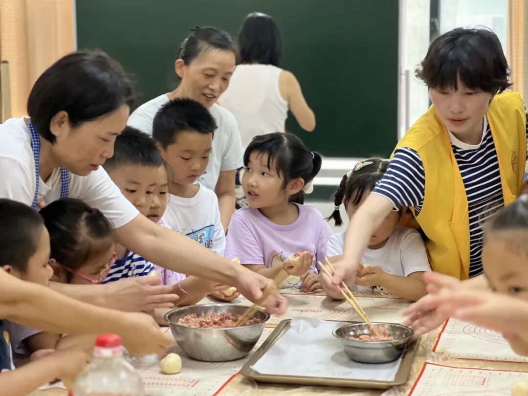 在老师和志愿者的带领下,孩子们洗净小手,开始尝试制作苏式月饼。揉面、包馅、收口……大家跟着社区“烘焙能手”们的动作,一个个有样学样。不一会儿,一只只圆滚滚的月饼面团就大功告成了。手法或许不够专业,成品或许不够精致,但大家的态度却很是认真。