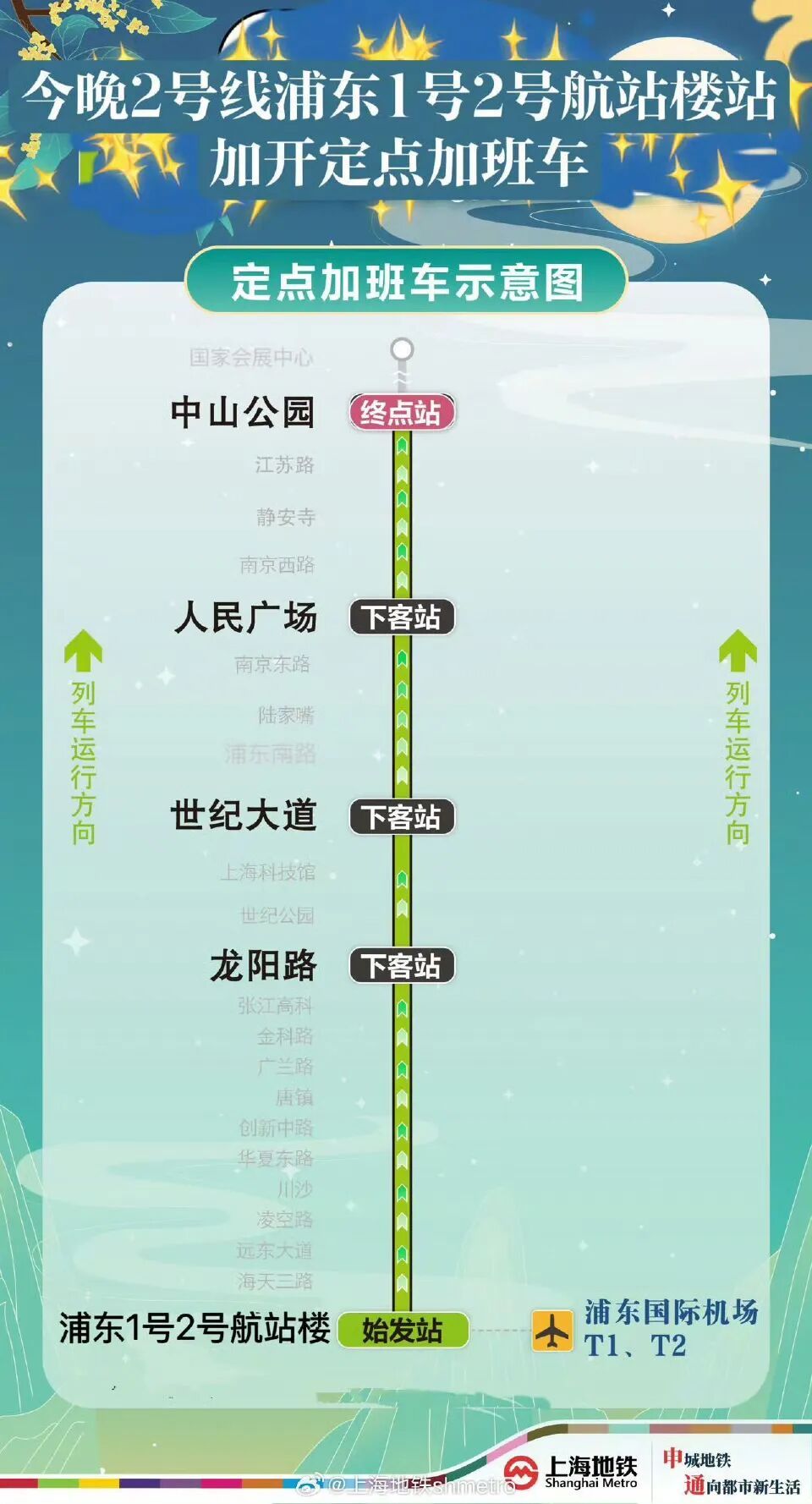 为集中运送夜间返程客流,今晚2、9号线加开定点加班车。2号线虹桥火车站站往龙阳路站加开至次日0时05分,2号线浦东1号2号航站楼站往中山公园站加开至23时30分,9号线上海松江站站往杨高中路站加开至次日0时。定点加班车只停靠指定站点。
