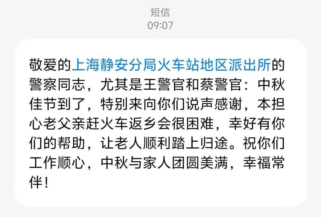 “祝你们工作顺心,中秋与家人团圆美满。”今天是中秋团圆佳节,一条来自安徽滁州的短信,让静安公安分局上海站地区治安派出所的民警心头一暖。原来,短信来自一位曾受帮助的八旬老人及其家属,字里行间满含感激与祝福,也为坚守岗位的民警们送上了一份别样的中秋祝福。