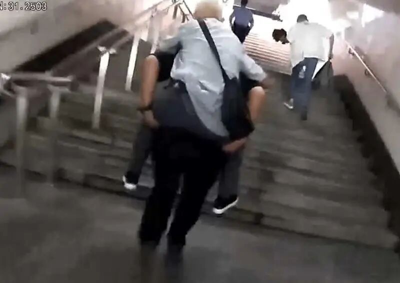 当天下午3点42分,距列车发车仅剩不到10分钟,老人所在的站台口距离上车位置较远,还需上下楼梯。时间紧迫,民警蔡杰蹲下身,将老人稳稳背起,在拥挤的人流中快步奔向列车。