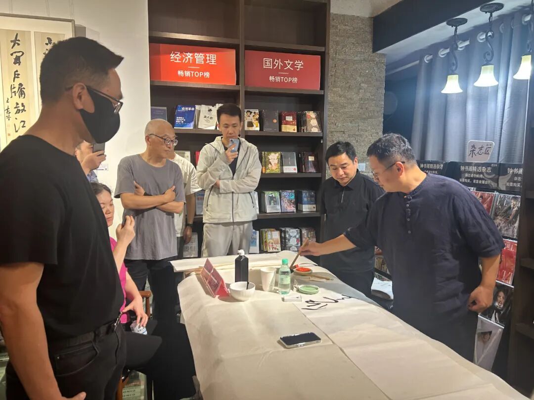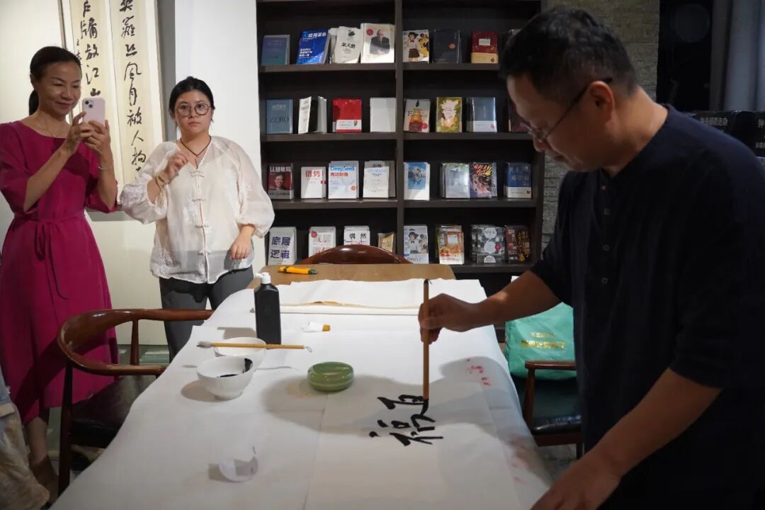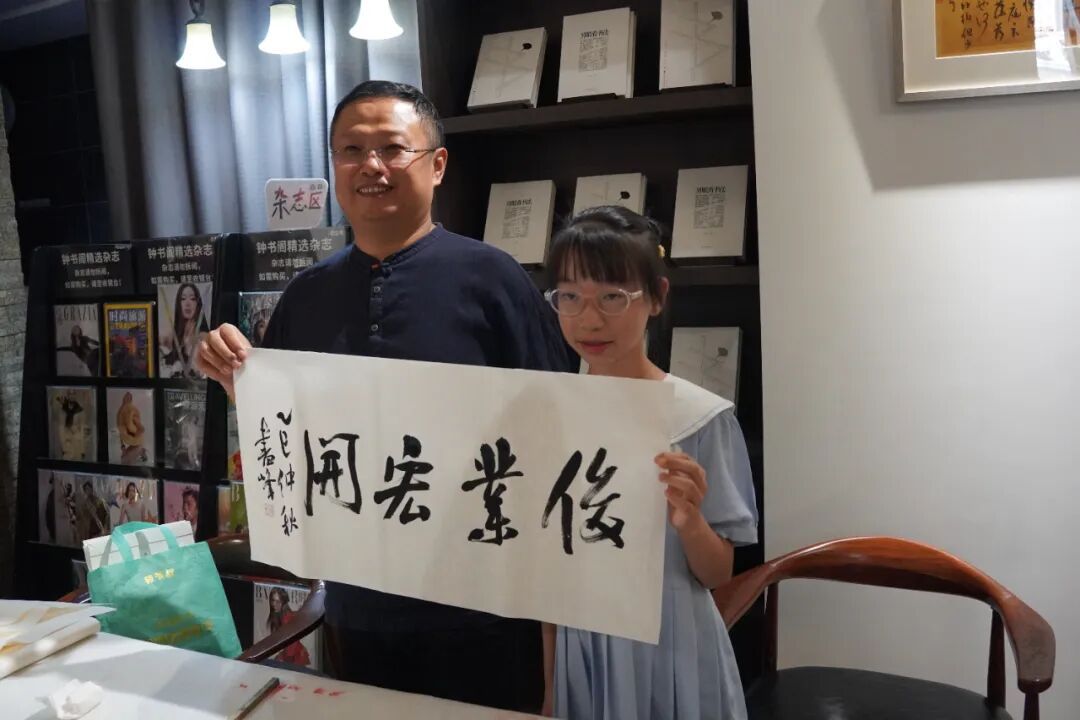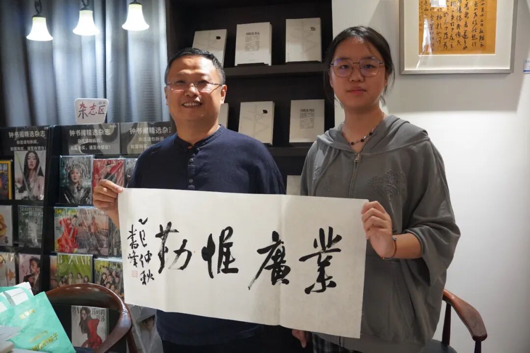 在为读者导览之后,活动进入了最令人期待的“赠字”环节。12岁的胡嘉怡小朋友想求“学业有成”四字,王书峰则委婉建议书写“业广惟勤”。“学业有成的前提是勤奋努力,只要持之以恒,让汗水滴落在每一个平凡的日子,终将汇成智慧的江河。”他解释道。11岁的陈珠雨歆的妈妈希望女儿“前程似锦”,王书峰略加思索,提笔写下“俊业宏开”。在他看来,虽然两词意思相近,但后者在意境和内涵上都更胜一筹。张小红女士想在自家茶室挂一幅“宁静致远”,经与王书峰交流,最终题写的是“山静日长,耕云种月”。“给人题字一般都挑吉祥话,但如果在内容上更讲究一些,常悬于家中便会回味无穷,更能起到静心励志的作用。”王书峰说。一连题写数幅作品后,他的笔力与才思赢得了现场读者的阵阵赞叹。
