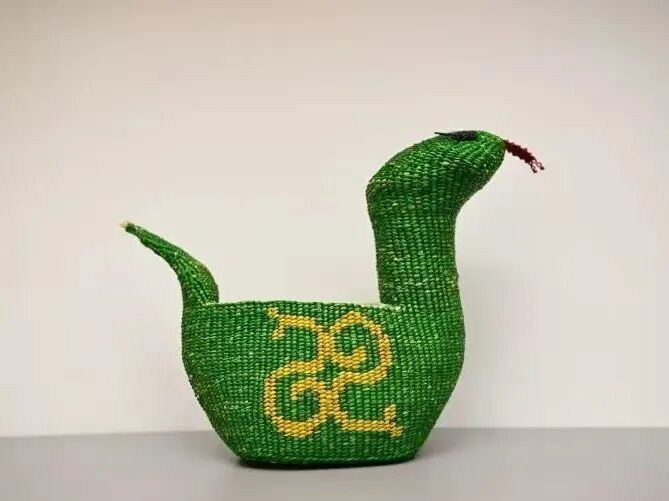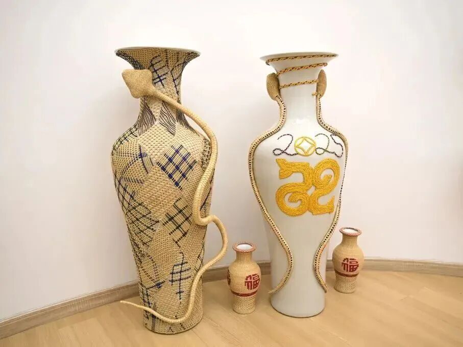 比如家居摆件“蛇”抱“瓶”安系列,作品由3条盘瓶而上的草编蛇组成,编织时轻挑出部分黄草模仿蛇鳞片,造型灵动又鲜活。