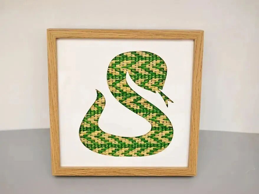 装饰画《织影蛇舞》利用不同颜色的黄草,编织出丰富的蛇纹效果,同时巧妙结合刻纸技艺,艺术感十足。