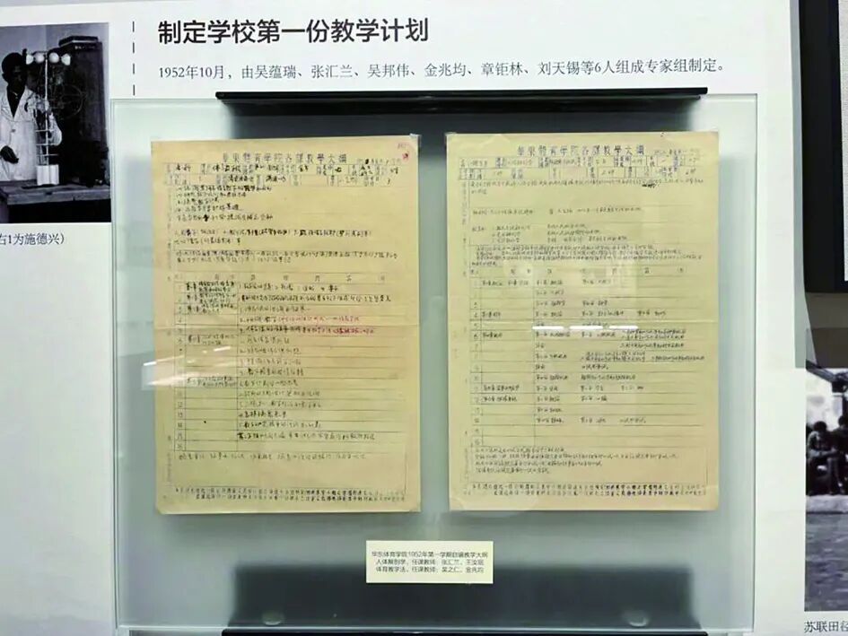 在展柜的一角,一份字迹斑驳、纸页泛黄的《华东体育学院各课教学大纲》静默陈列。这是学校的首份教学计划,由吴蕴瑞、张汇兰等六名专家共同拟定。大纲细致规划了课程目标、教学方法、考试形式,字里行间透露出创校之初的艰辛与坚韧。
