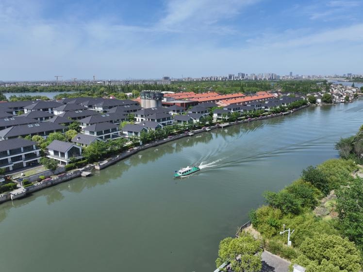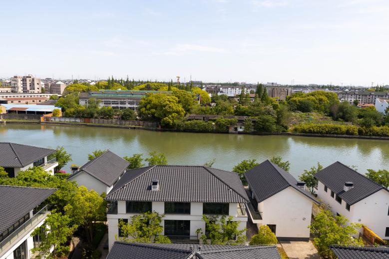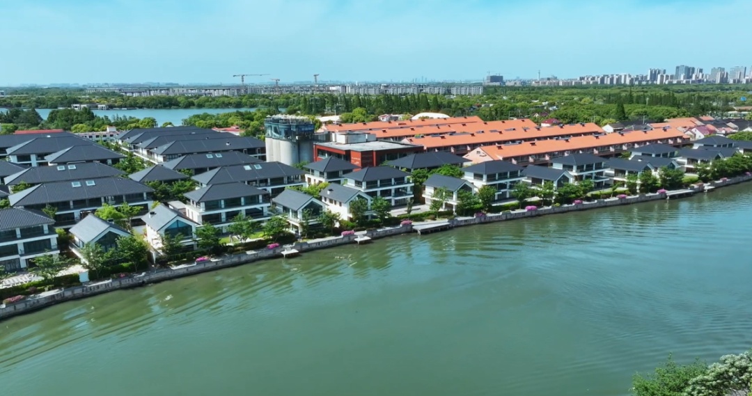 建筑设计巧妙地将这两处水景融入其中。空中俯观的淀浦河如一条蜿蜒的丝带,静静流淌在古镇的怀抱中。河水在阳光下泛着粼粼波光,与两岸粉墙黛瓦的民居相映成趣。
