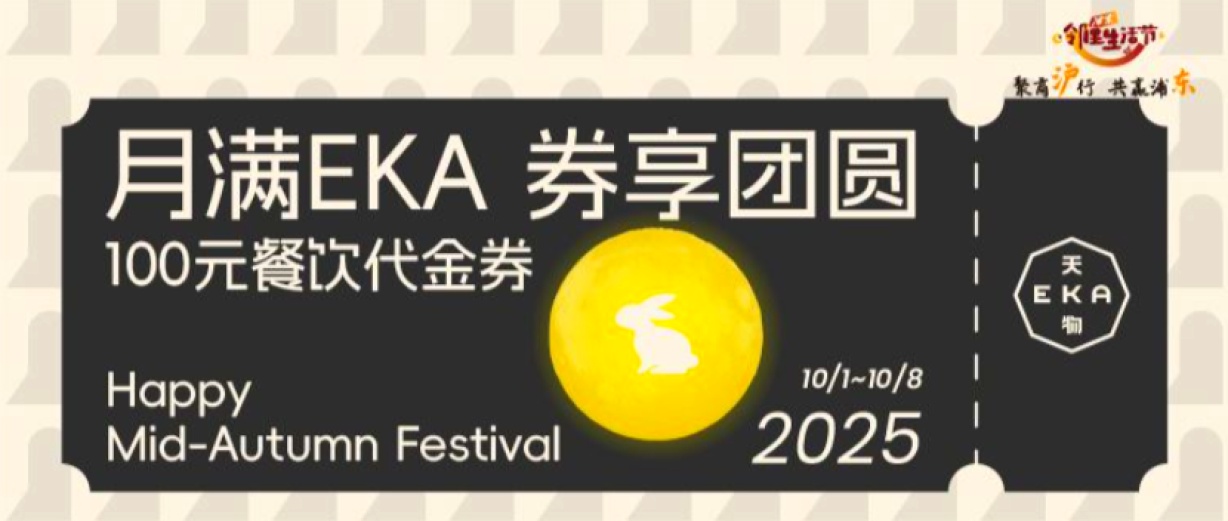 10月1日至8日,在EKA·天物小程序参与活动,花费会员100积分兑换100元餐饮代金券1张,可在指定商户使用。