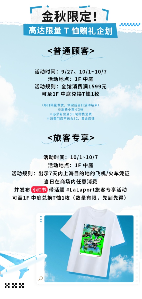 10月1日至7日,顾客参与消费活动可领取高达限量T恤,旅客凭7天内上海目的地飞机/火车凭证还可参与专享活动。