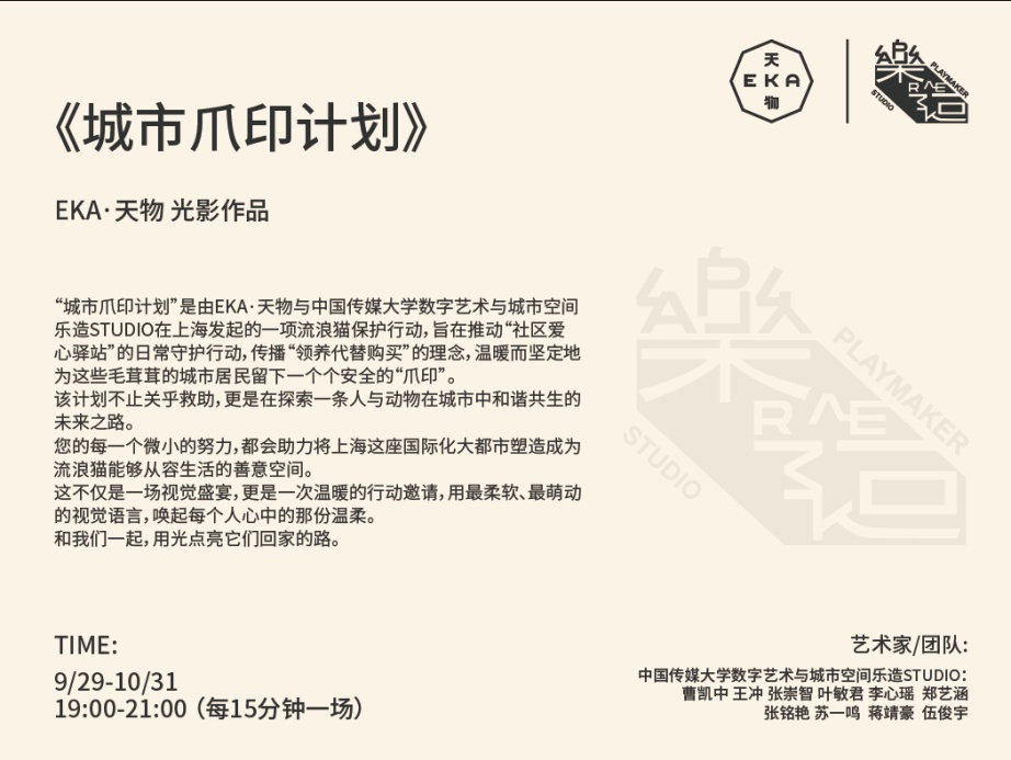 “城市爪印计划”是由EKA·天物与中国传媒大学数字艺术与城市空间乐造STUDIO在上海发起的一项流浪猫保护行动,旨在推动“社区爱心驿站”的日常守护行动,传播“领养代替购买”的理念。