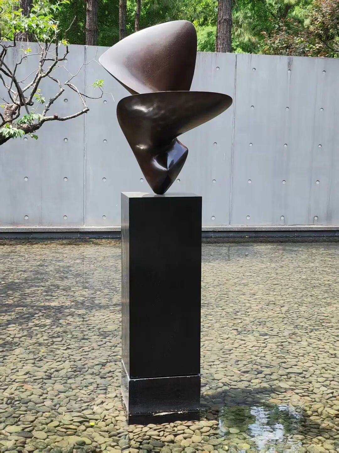 不远处,美国著名雕塑家汉斯·凡·德·伯文卡普的作品《舞动·凝视》轻逸灵动,似凌空舞动着。艺术家以刚硬的金属为材质,通过巧妙的结构设计,让原本厚重的材料呈现出流动飘逸的美感——作品形似两只大手相握相牵,立于恰到好处的高度,带来极具冲击力的视觉体验。金属材质,却承载着柔软而温暖的情感世界,于刚柔相济间,为城市空间增添了“艺术温度”的新注脚。闪亮的银色凌空舞动,成为上海静安雕塑公园中一道亮眼的风景。