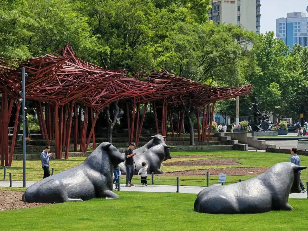 再往里走,是公园一片开阔的凹地。几头憨态可掬的牛儿静卧于此,仿佛这片地儿本就是为它们量身打造的。酷热天气里,目光触及这些慵懒又栩栩如生的牛儿,让人联想到水牛浸在水中沐浴的清凉——对顶着酷暑行走的人们,算是一种“望梅止渴”的慰藉吧。
