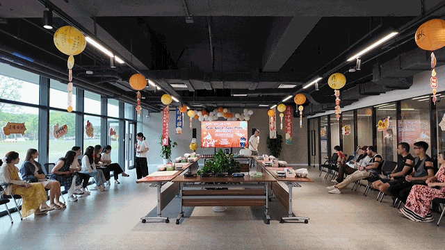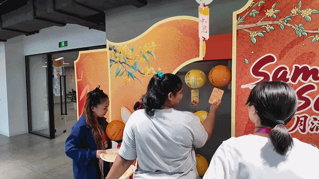 月饼制作结束后,工作人员又带领大家开展猜灯谜活动。现场悬挂的灯谜涵盖文化、习俗等多个领域,中外友人积极参与,相互探讨,在趣味互动中进一步加深对中国文化的了解。