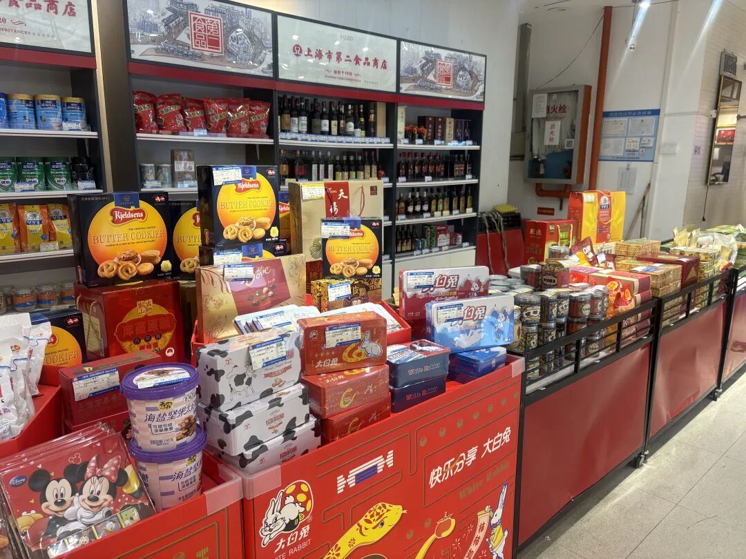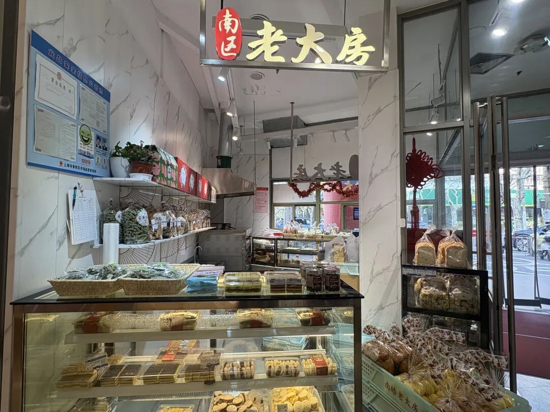 在第二食品商店的商品区,南区老大房、老半斋、功德林的糕点摆满货架。苔条饼散发着大海与面粉交织的独特香气。老上海的萨琪玛,一改如今软糯的口感,呈现出脆硬的口感,甜而不腻。蝴蝶酥、条头糕则是阿拉爷叔、姆妈的心头好,轻轻一抿,那股质朴的甜香就在齿间晕开。