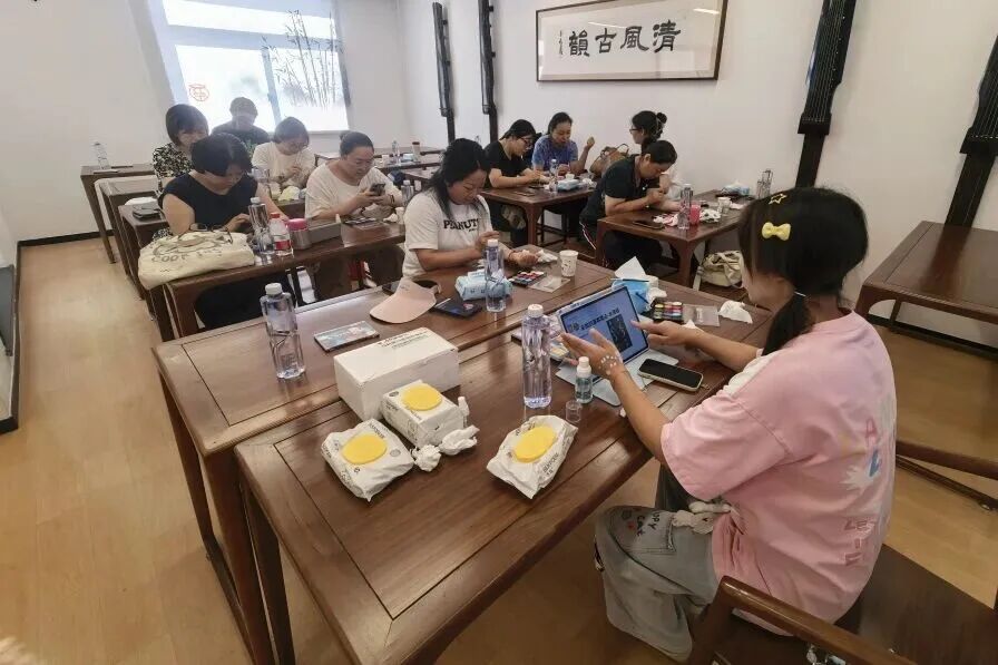 在笔法教学环节,彩绘老师通过现场演示,教授妈妈们如何绘制圆润饱满的花瓣、有粗细变化的水滴线与蝴蝶线以及优雅的卷草线等基本笔法。