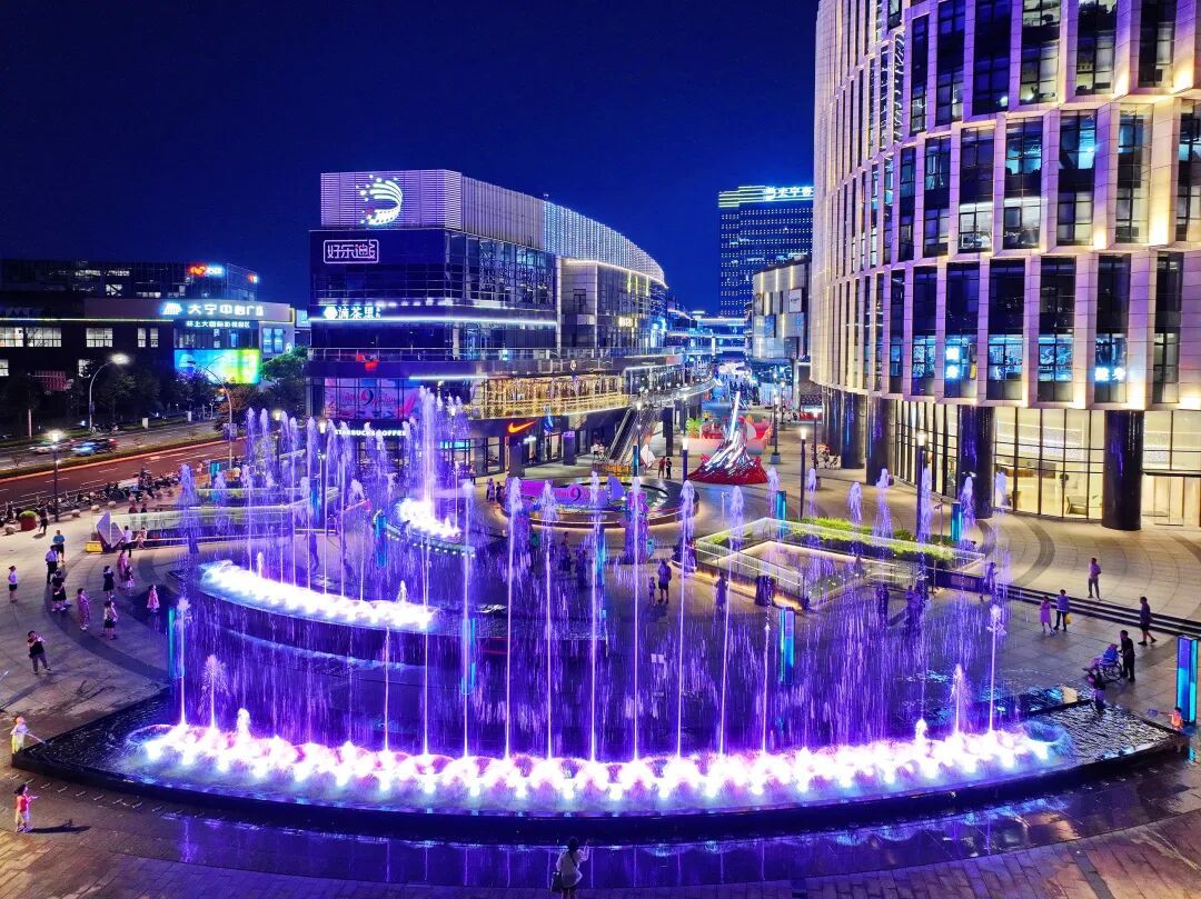 2025年夏天拍摄于上海大宁音乐广场,大型音乐喷泉,灯光绚丽,搭配建筑夜景,营造出热闹且时尚的氛围。