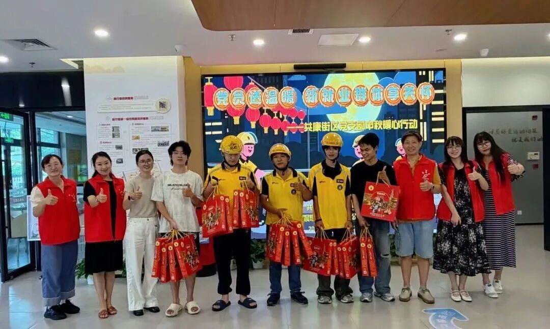 共康党群服务中心内爱意涌动,“党员送温暖 新就业群体享关怀”中秋暖心行活动正在这里举行。共康街区爱心企业家党员们将一盒盒饱含节日祝福的月饼送到骑手们手中,让这些平日奔波在街头巷尾的劳动者感受到了别样的温情。