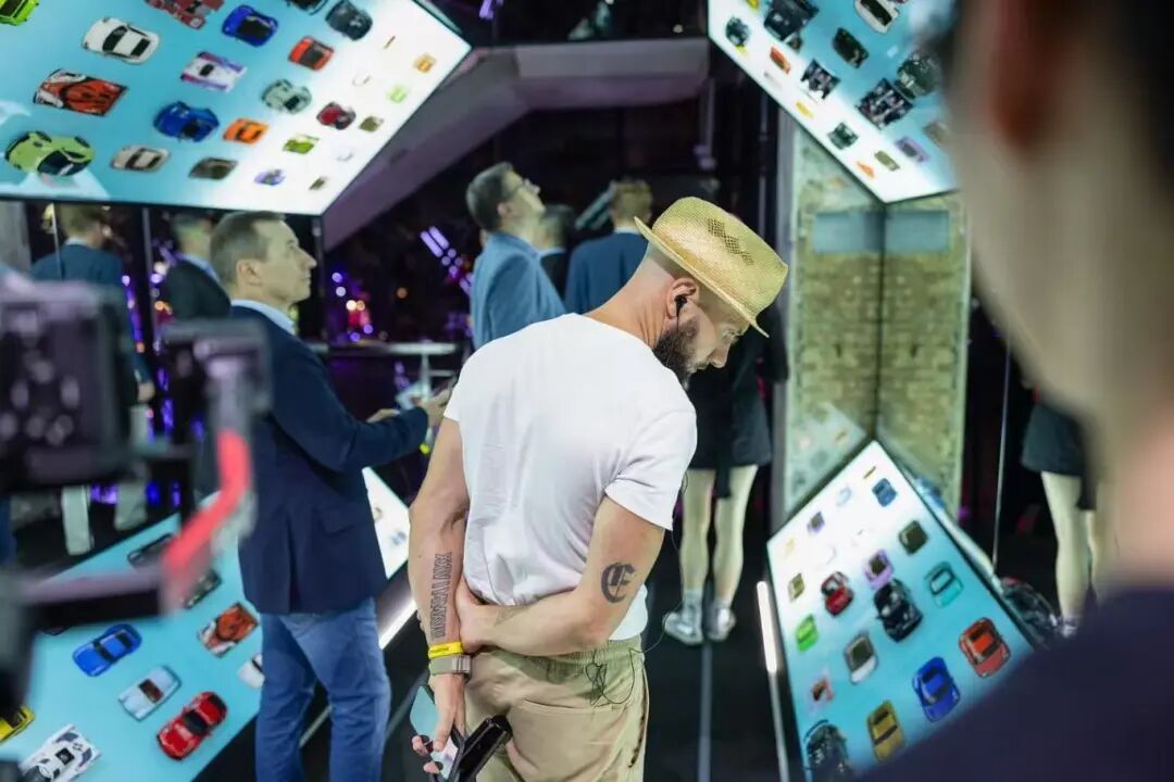 沿着楼梯步入二层,展区主题从历史传承转向个性化的深度探索。“为梦着色”展区内,超过200把车钥匙在灯光下交织出绚烂光影,对应保时捷为中国市场提供的丰富车漆选择,生动诠释着“您的梦想,我们打造”的个性化服务理念。