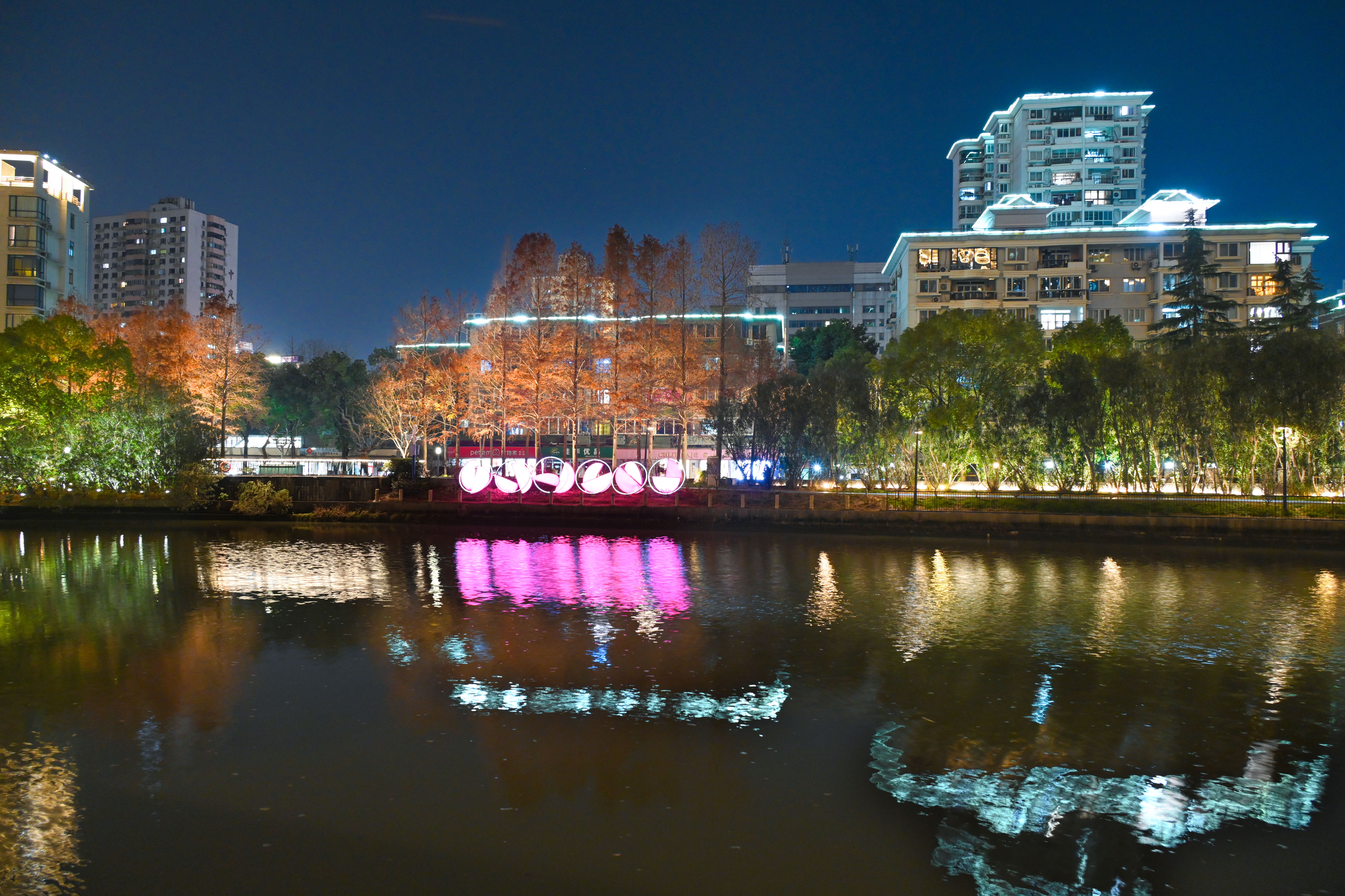 江宁路桥在节日张灯结彩时尤为动人,从高楼俯拍,能同时收下桥、河与人的活动场景。