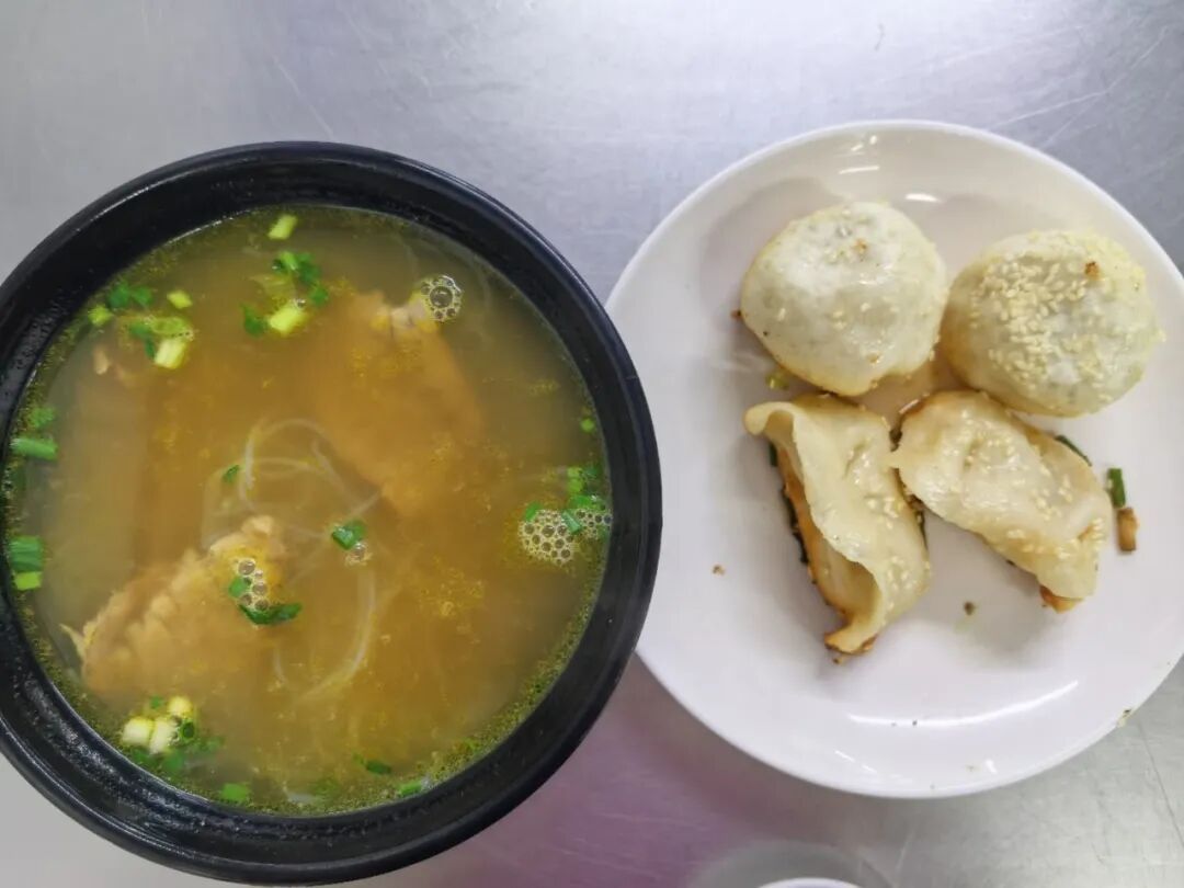 生煎的外皮泛着油光,底部煎得薄脆却不焦煳,用筷子轻夹,能察觉到面皮的松软弹性。咬开小口,鲜甜的汤汁顺势溢出,量也恰到好处:既不会因“飙汁”让人狼狈,又能让每一口都浸润着肉馅的鲜香。其调味严守老上海“鲜而不咸”的准则,半发面皮松软中带着嚼劲,裹着紧实饱满的肉馅,即便不蘸醋,也能吃出纯粹的本味。尝了生煎,“宁宁”又迫不及待地吃了锅贴,锅贴边缘微焦,咬开后葱香与肉香交织,与生煎的鲜甜巧妙互补,口感层次分明。而搭配的牛肉粉丝汤,则是解腻的“黄金搭档”:清亮的汤头鲜醇不腻,粉丝吸足汤汁后软滑入味,几片牛肉纹理清晰、口感鲜嫩,撒上少许香菜与葱花,香气更显浓郁,一口汤一口生煎,味蕾瞬间被抚慰。