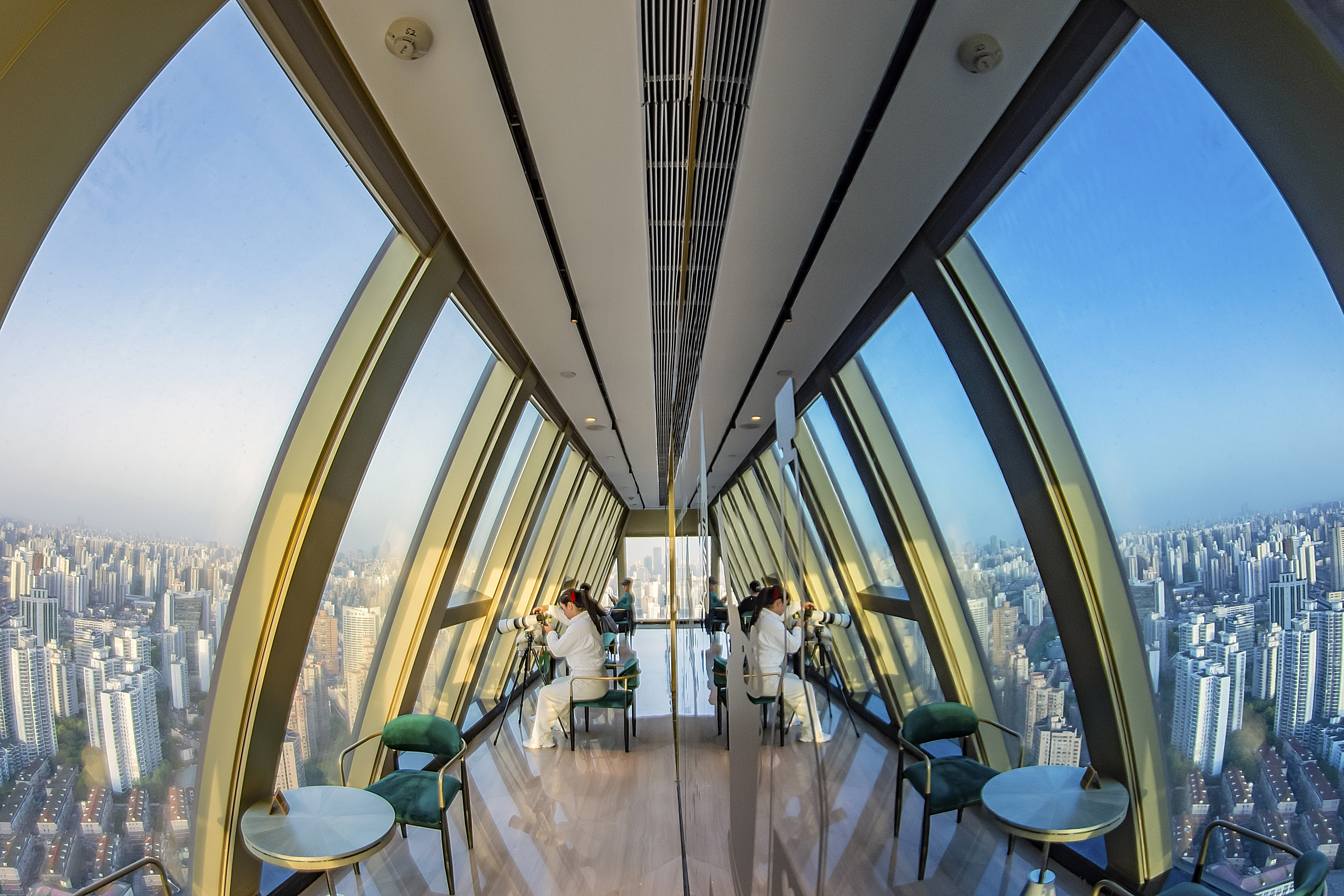 3、乘电梯至环球港52层观光平台,俯瞰普陀城廓及观光平台游人活动,捕捉人与城的互动瞬间。