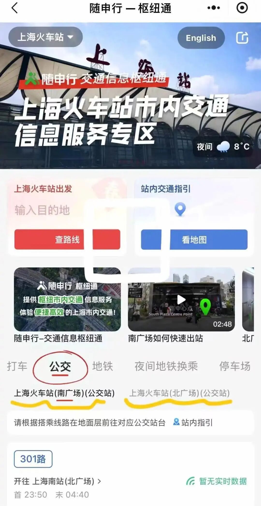 (二)如您到站后计划乘坐公交车,建议提前通过地图软件搜索站点方位前往路线,或者通过“随申行-枢纽通”小程序,快速查找公交站点等准确信息,非常精准。