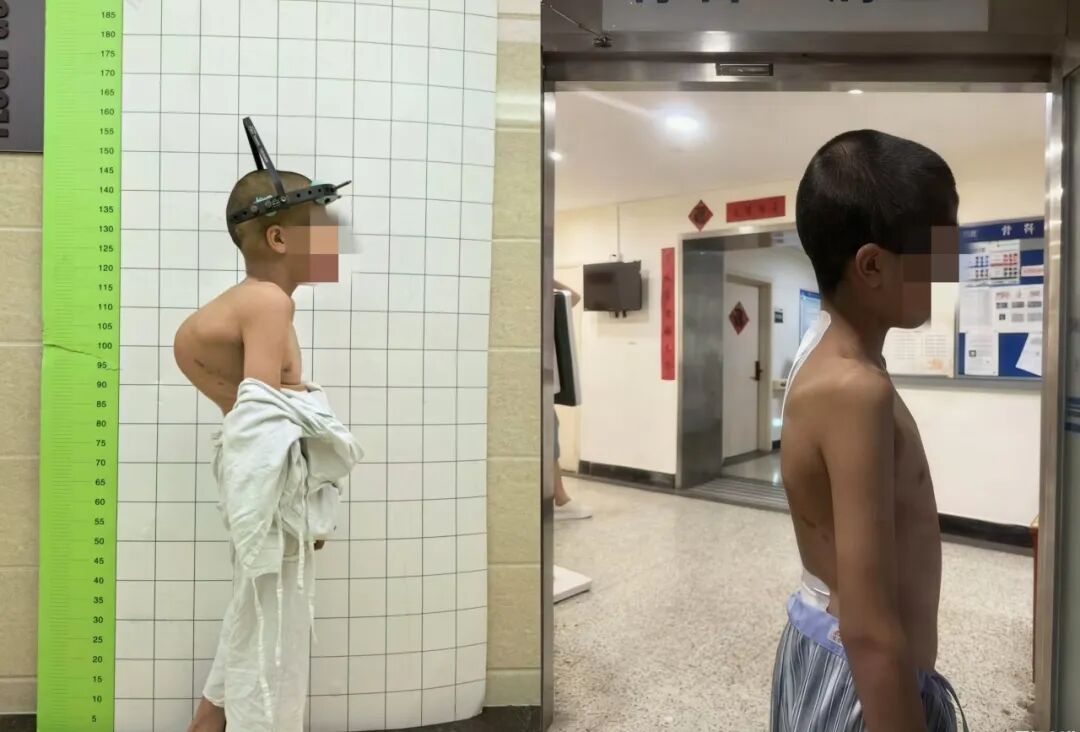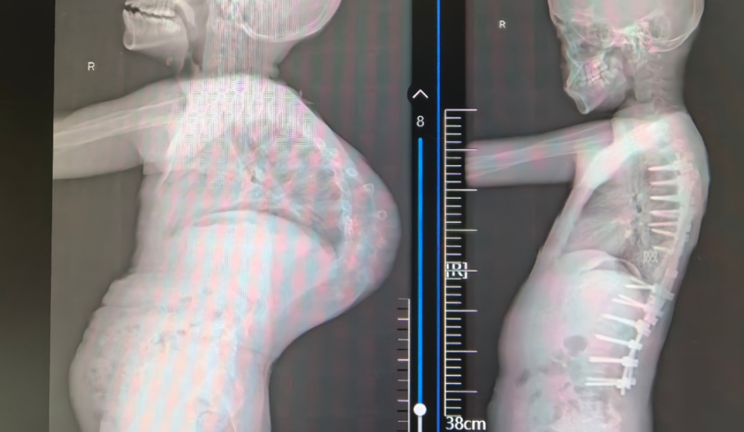 随着小禹长大,“小山坡” 越来越明显,脊髓被扭曲的脊柱拽得紧绷,全身还散着淡褐色牛奶咖啡斑,这是一种遗传疾病——神经纤维瘤病的典型信号。家人带他跑了多家医院,得到的答案却如出一辙:脊柱侧弯已近乎150度,不仅侧凸,还有后凸,脊髓受压严重,最严重区域的脊柱基本快掉头生长,再加上肺部被挤压变形,手术可能致瘫痪,风险太高。小禹的治疗之路,成了一道没人敢跨的 “坎”。