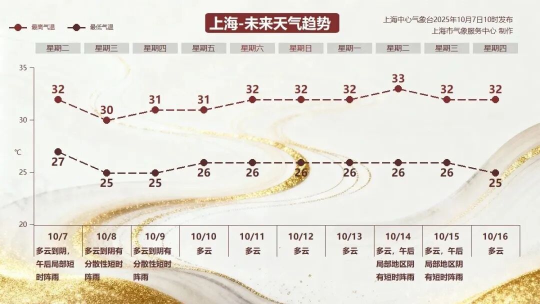 上海中心气象台预计,明天是假期最后一天,也是二十四节气中的寒露节气,申城云系依然较多,并伴有分散性短时阵雨,最高气温在30℃附近。9日是工作日,维持类似的天气格局。周五起天气转好,多云为主,气温总体维持在26~32℃之间。