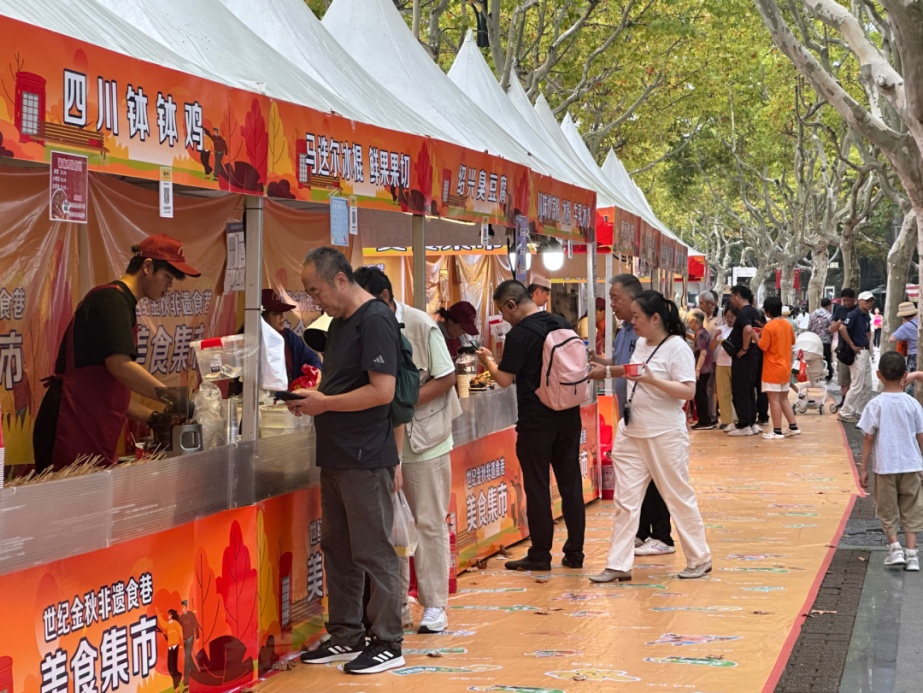 国庆长假期间,世纪公园迎来了一场融合美食、文化与艺术的盛宴。10月1日至10月12日,位于镜天湖畔的“世纪金秋 非遗食巷”主题美食集市热闹开市,一家家特色摊位沿湖排开,香气四溢的现场制作美食、蒸腾的热气与游客的欢声笑语,共同织就了一幅金秋烟火盛景。