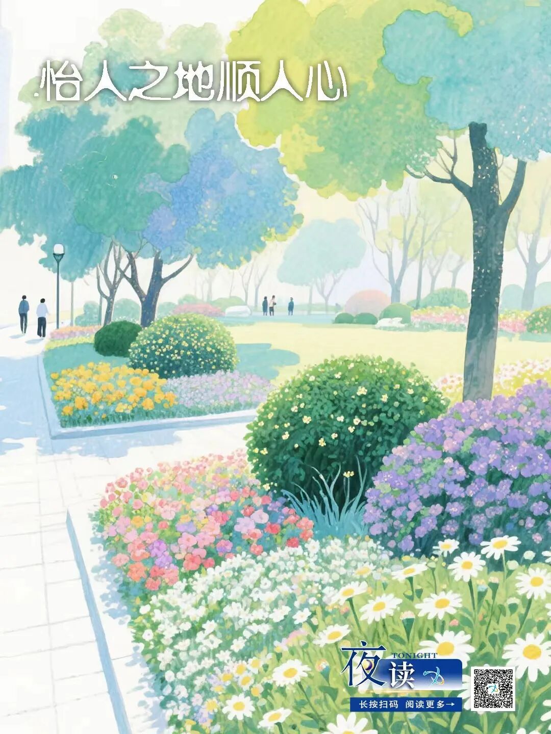 人说这是口袋公园,而我却觉得这如同神笔马良的画中公园,以前抬头是店铺低头是小摊,路人购物结束后就疾步离去,如今店铺倏忽间减少突然多了一个可以伸展腰肢、观花赏树的自然天地,走路不必风风火火,笃行慢步的节奏让我心绪安宁,眼清目明。每天清晨路经此地的过客都会像我一样放慢脚步,欣赏这片养眼舒心的绿色风景线。夜幕降临时,更多的居民都会在其中信步畅游,呼吸草木之清香,闲聊客堂家长与里短。