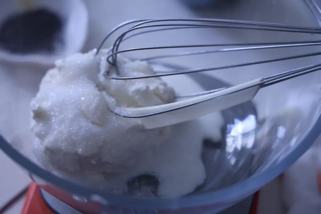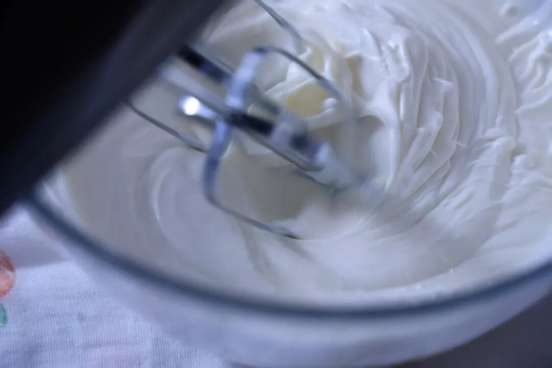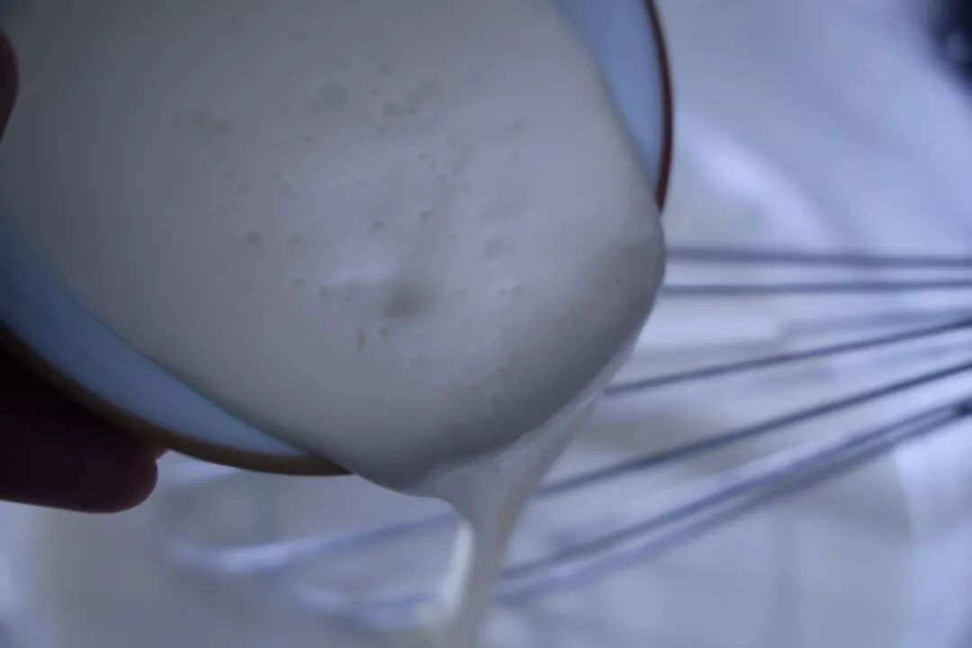 2.淡奶油打发至6分,平底锅内倒入牛奶。