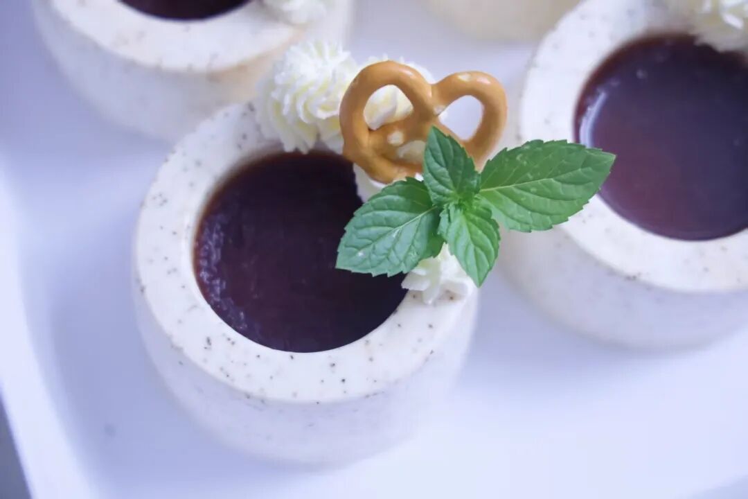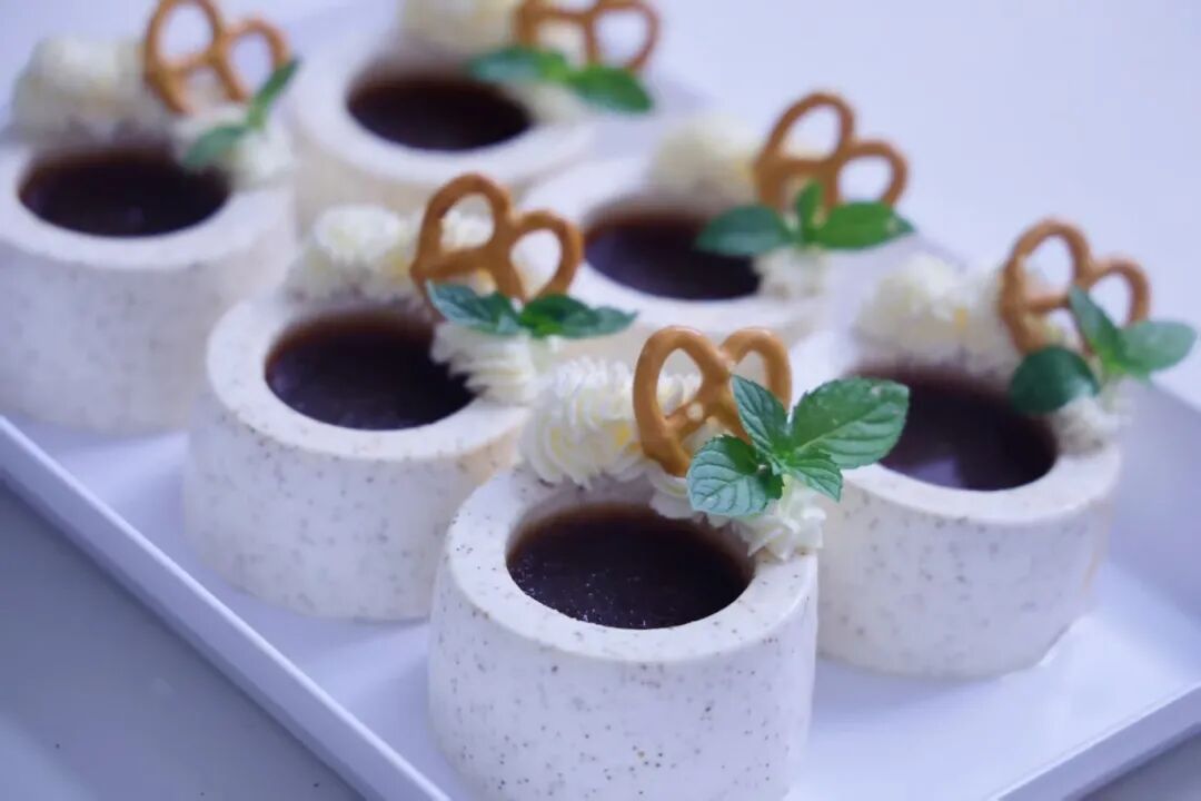 9.冷藏2小时,用薄荷、饼干装饰,完成。
