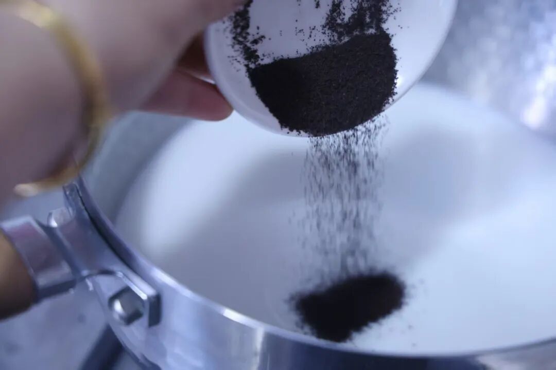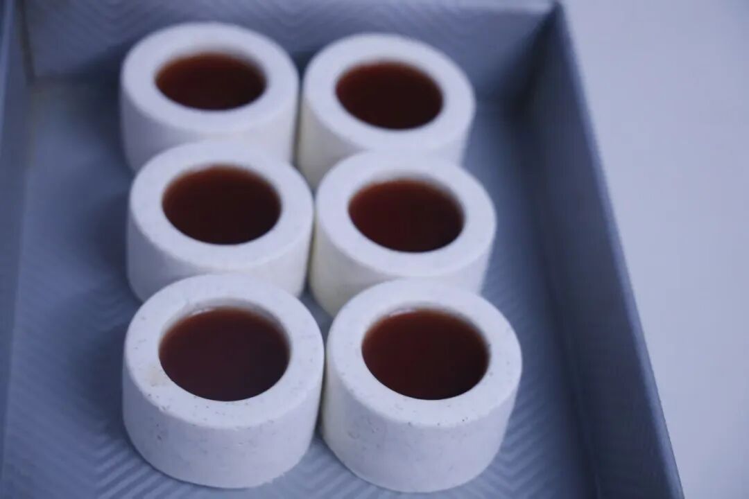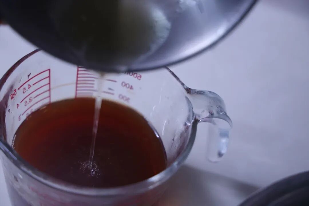 8.吉利丁融化后,倒入红茶内,加8克糖粉,搅拌均匀,倒入慕斯杯。