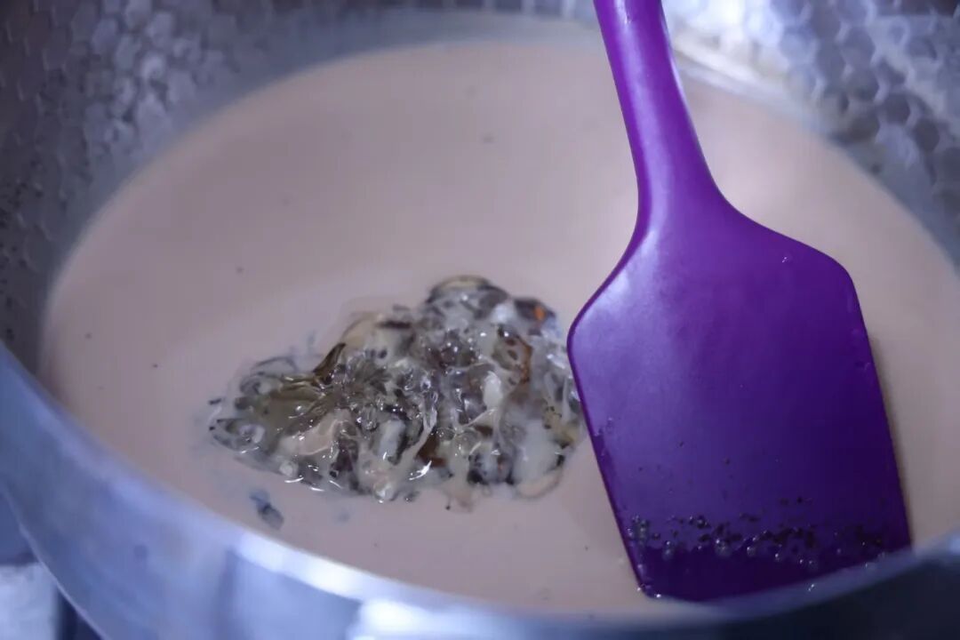 4.冷却至60°后加入泡软的吉利丁,搅拌均匀。