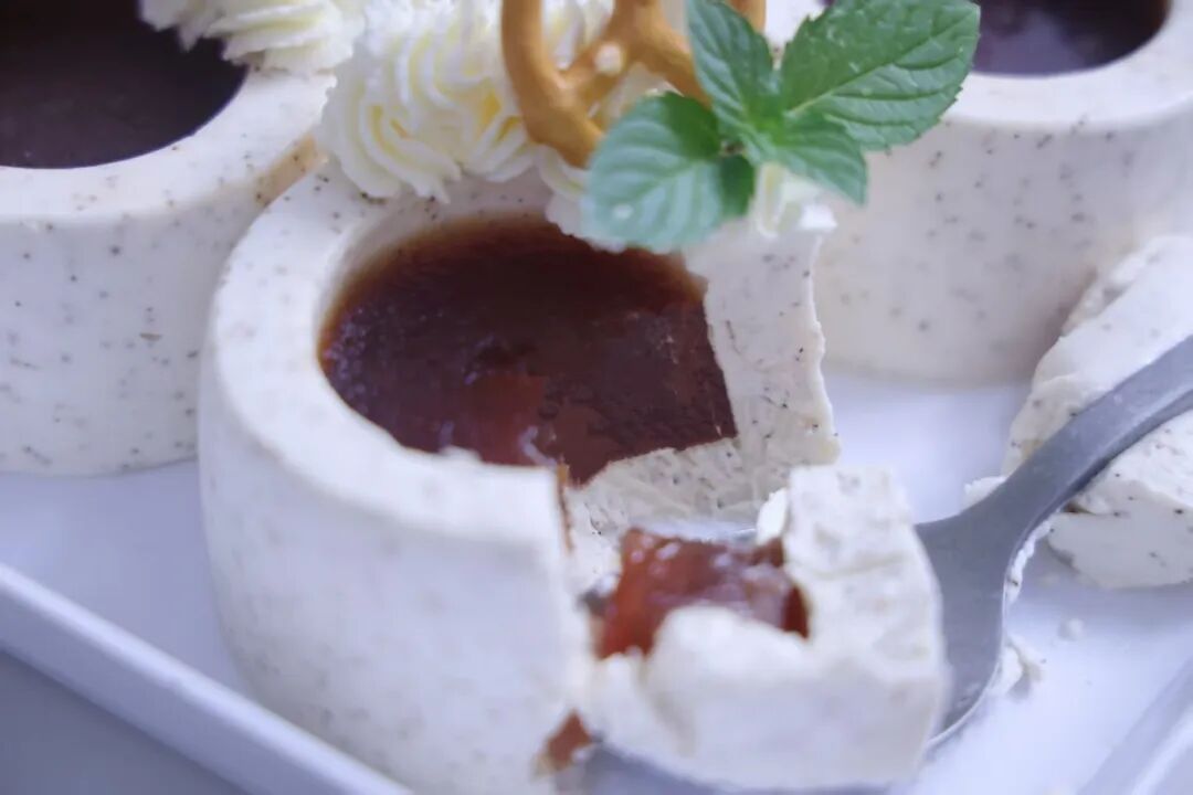 5.冷却至30°左右倒入慕斯糊,混合均匀。