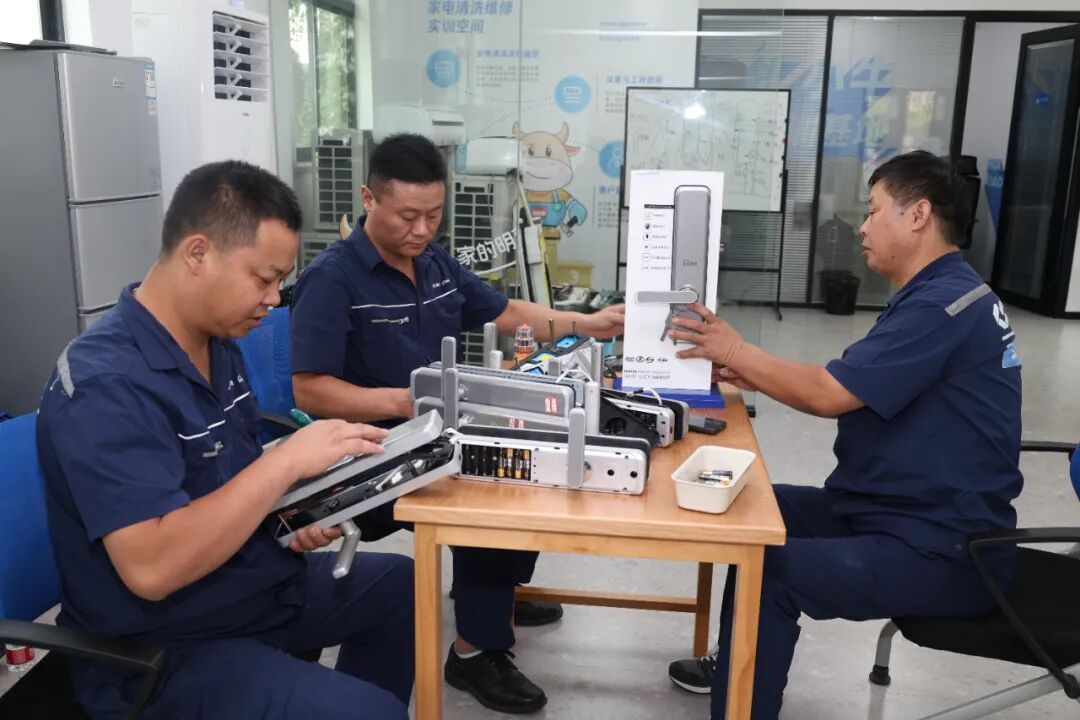 二楼是家电清洗实训空间,空调、洗衣机、冰箱、油烟机等大型家电被拆解开。三楼的电工维修实训空间,是电工对各类电路进行练习的场所。几位电工在其中进行电子门锁的维修练习,一遍遍地拆了装、装了拆,还要调试是否可以使用。一位50多岁的电工对记者表示:“我接触这种电子门锁才1年多,很多技术还在摸索中,所以要多来练习。”汇小牛实训基地相关负责人告诉记者:“很多时候,家里的电器不是表面清洗就可以的,比如油烟机的清洗,还要清洗管道内部,所以要求维修清洗师傅也要更加专业才行。”