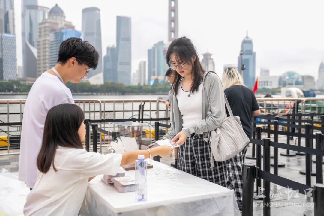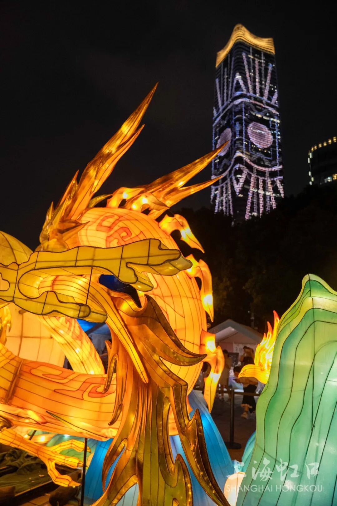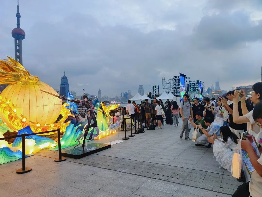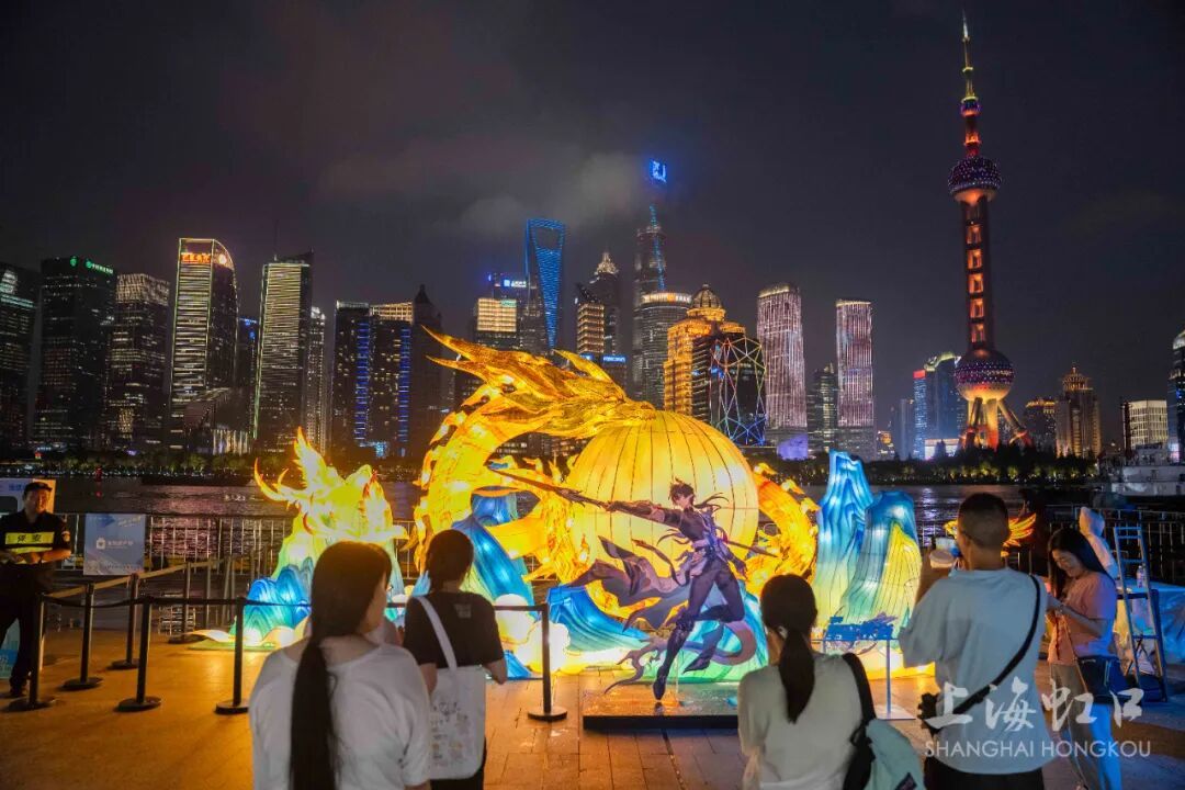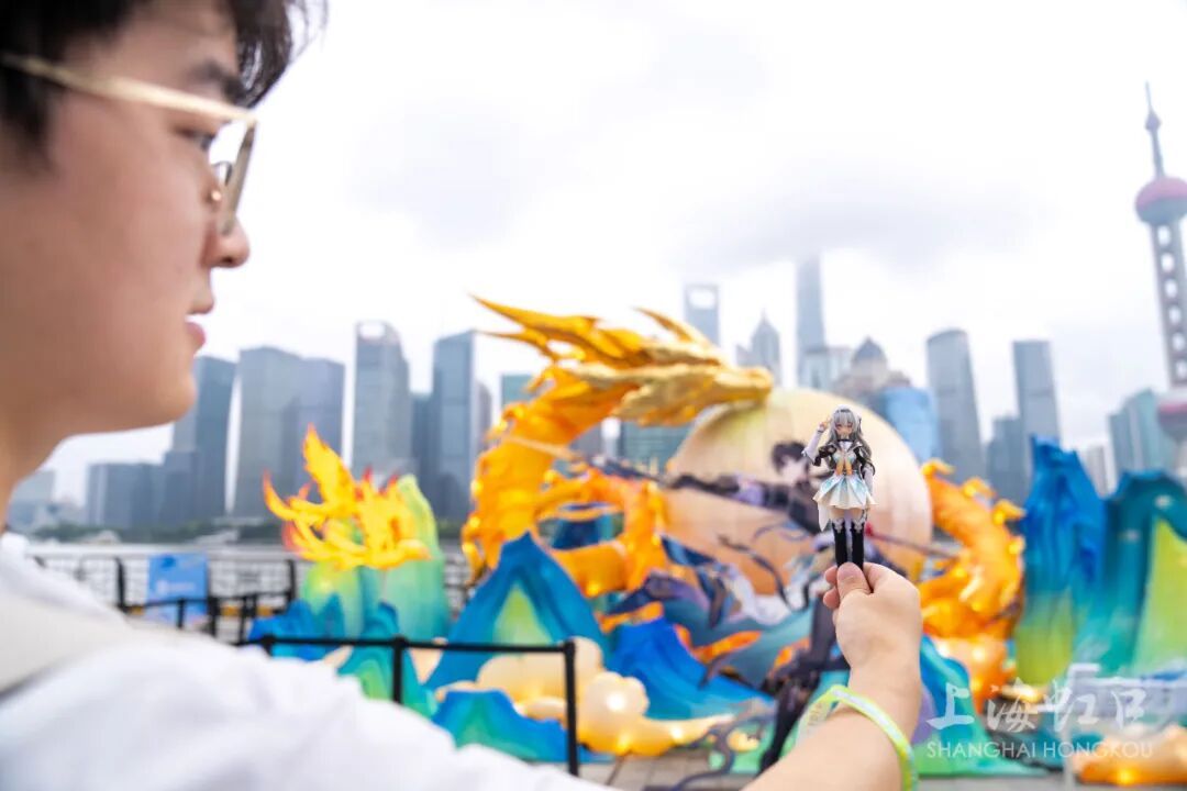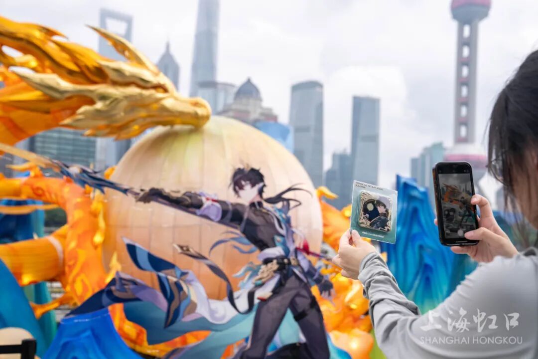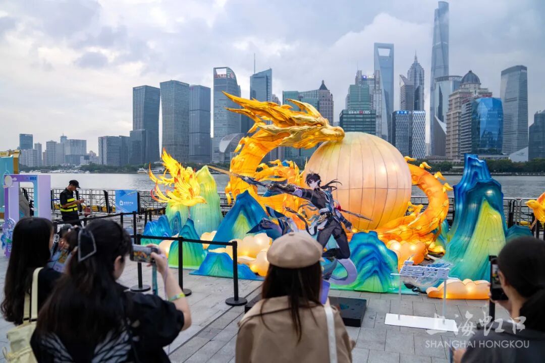 这一充满传统意境的花灯装置,与北外滩、浦江两岸的现代楼宇形成鲜明又和谐的“古今对比”。传统与现代在此碰撞出奇妙的火花,现场不时有游戏迷在装置前拿着“谷子”调整角度,用镜头定格这独特的“星穹浪漫”。