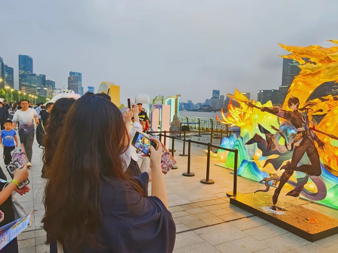 从宁波专程赶来的郑先生,是《崩坏:星穹铁道》的忠实玩家。他手持自制的“流萤”人偶站在“金龙照月圆”装置前,让同伴帮忙记录下这一时刻。