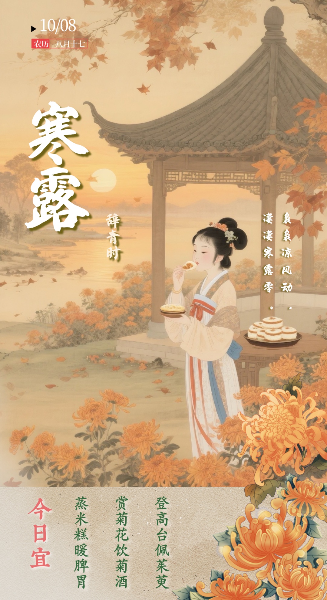 “袅袅凉风动,凄凄寒露零。”每年公历10月8日前后,寒露,便踏着秋霜如约而至。作为二十四节气中第一个带“寒”字的节气,它标志着孟秋的余热散尽,仲秋的清寒渐浓。