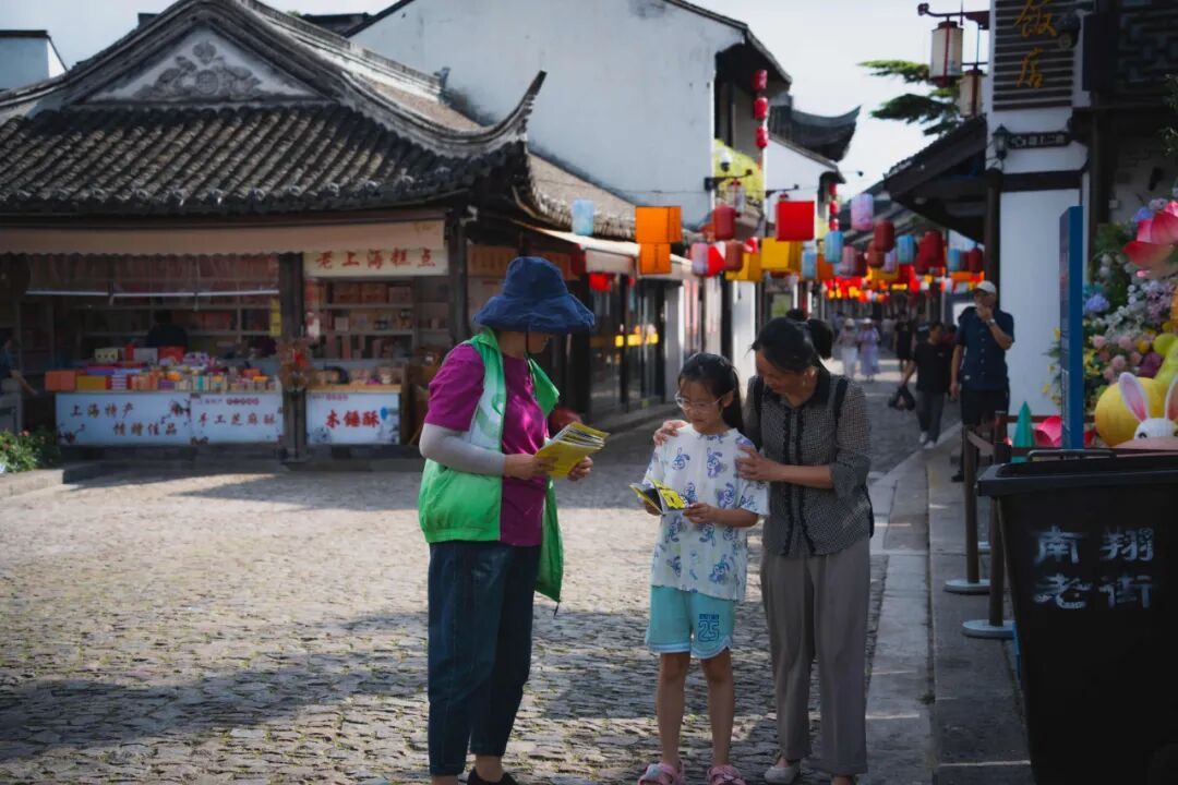 为进一步增强文明引导力量,双节期间,南翔古镇还增派了志愿者担任文明旅游劝导员。他们身着统一标识马甲,活跃在景区各处,以热情友善的态度为游客提供及时帮助,耐心劝导个别不文明行为。
