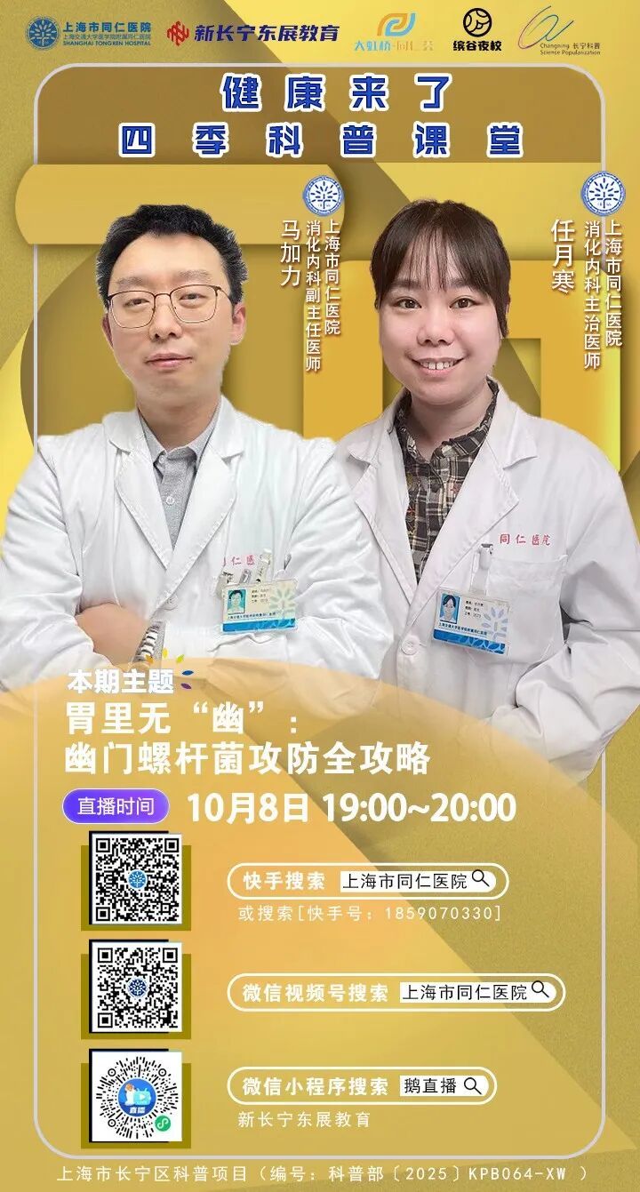 今天(10月8日)19:00—20:00,“上海长宁”APP将与上海市同仁医院“大虹桥·同仁荟健康直播”共同直播:胃里无“幽”,幽门螺杆菌攻防全攻略。