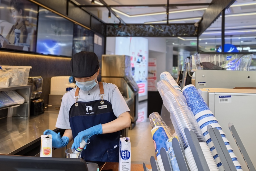新店位于长宁路1033号,与中国联通大厦一层营业大厅相连通,占地面积约50平方米,空间十分开阔。“宁宁”到访时,不少白领和居民前来拿取咖啡。对于不擅长用手机下单的老年人,店员也会提供贴心的帮助,并推荐更适合长者的饮品。