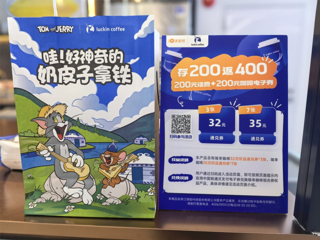 门店显眼位置摆放了优惠活动海报,通过中国联通官方支付系统“沃支付”充值话费200元,即可获得价值400元的咖啡电子券,包含3张“瑞幸咖啡32元饮品通兑券”和7张“瑞幸咖啡35元饮品通兑券”。