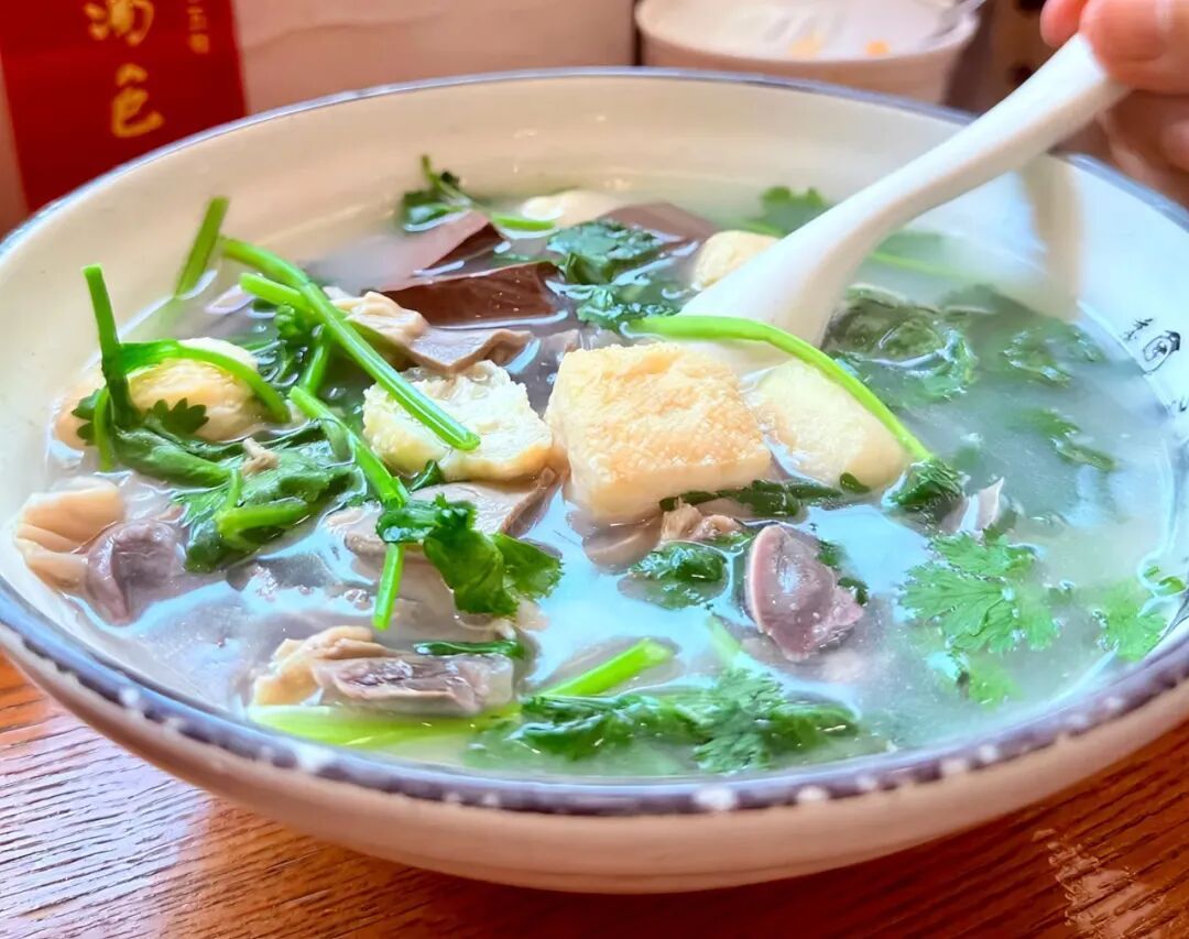 除了汤包,店里的老鸭粉丝汤堪称“隐藏王牌”,是老客们的“标配搭档”。汤锅里的老鸭每天慢炖4小时,汤色清澈却鲜得醇厚,几乎看不到油渍;盛碗时,鸭胗、鸭肠、鸭血、豆腐泡满满当当铺在粉丝上,粉丝吸饱汤汁后,每一口都透着鲜。“一笼汤包配一碗汤,三十多块钱吃到撑”,这是食客们对小店性价比的一致认可。