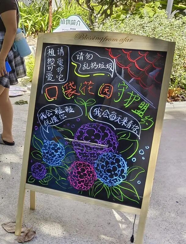 在筹备阶段,孩子们在社区老师的带领下,学习如何识别和种植草药。他们用画笔在黑板上描绘薄荷的翠绿叶片和紫苏的脉络纹理,配上“请爱护它”和“我会每天都来看你”的“誓言”。